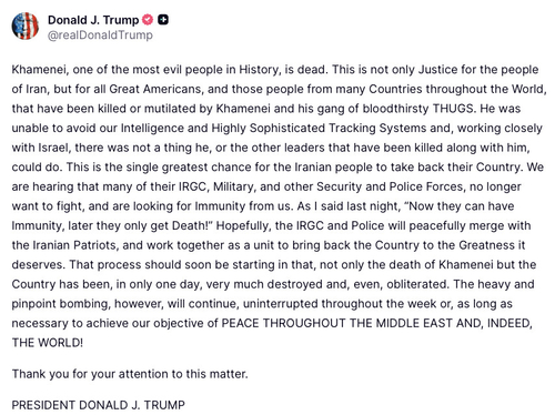 도널드 트럼프 대통령은 이란 최고 지도자인 아야톨라 세예드 알리 하메네이가 사망했다고 오늘(28일) 발표했다. 도널드 트럼프 대통령은 오늘(28일) SNS 트루스소셜을 통해역사상 가장 사악한 사람 중 한 명인 하메네이가 사망했다며 이는 이란 국민뿐만 아니라 모든 위대한 미국인들, 그리고 전 세계 여러 나라 사람들을 위한 정의라고 밝혔다. 도널드 트럼프
