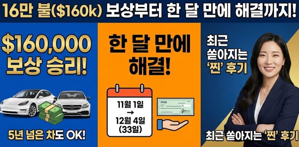 (테슬라 & 벤츠 오너, R 고객님의 후기) "5년 넘게 탄 차라 안 될 줄 알았어요." 많은 분들이 '산 지 오래된 차'는 레몬법이 안 된다고 포기하십니다. 하지만 R 고객님은 포기하지 않으셨습니다. 테슬라와 벤츠, 두 대의 차량에서 발생한 악몽 같은 결함들. 저희는 5년이라는 긴 소유 기간 동안 발생한 문제들을 집요하게 파고들었습니다. 결과는 두 차량 모두 제조사 재매입(Repurchase) 성공! 놀라지 마세요. 무려 $160,000이 넘는 보상금을 환불받으셨습니다. "벌써 10명 넘게 지인들에게 소개했어요!" 라는 고객님의 말씀이 저희에겐 최고의 칭찬이었습니다.