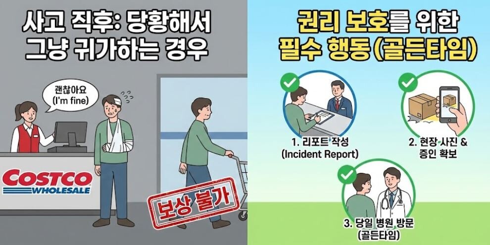 1. "매니저 오라 그래!" (Incident Report 확보) 가장 중요한 첫 단추입니다. "괜찮아요" 하고 그냥 나오지 마세요. 반드시 매니저를 불러서 사고 경위서(Incident Report)를 작성하고, 그 복사본이나 리포트 번호를 받아두셔야 합니다.