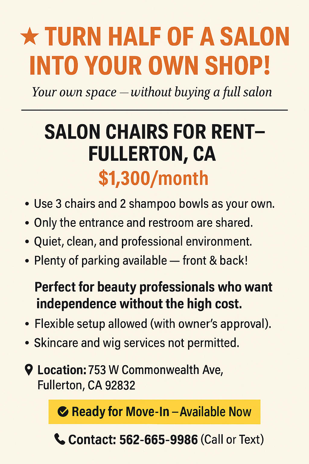 ????‍♀️ 1 Chair or Half-Salon Space for Rent – Fullerton ????