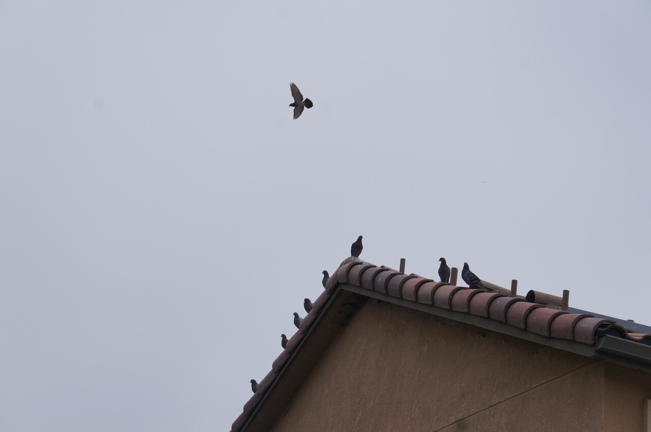 지붕위에 몰려드는 수십마리 비둘기떼.
