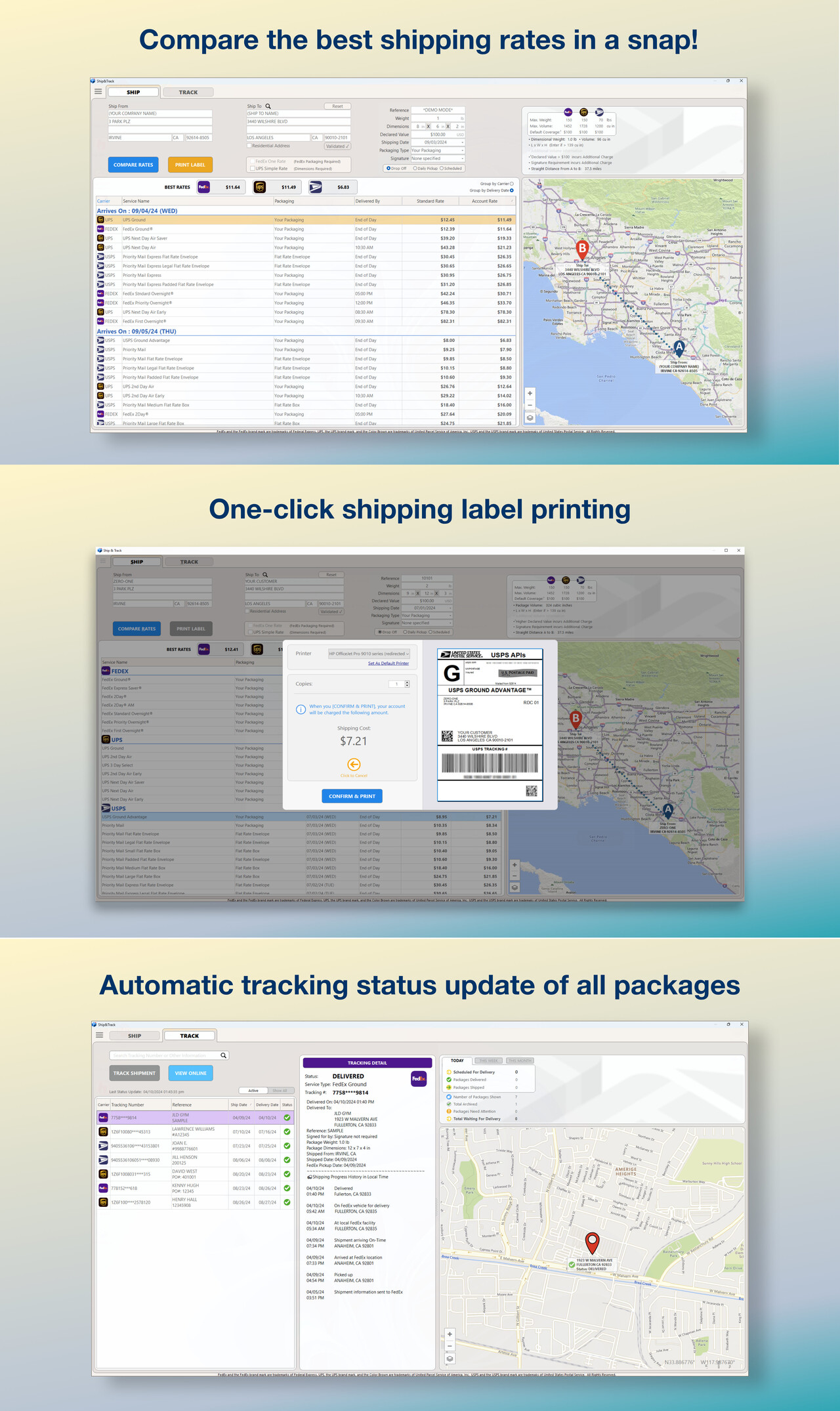 FedEx, UPS, USPS의 모든 SHIPPING OPTION, DELIVERY DATE, RETAIL PRICE, ACCOUNT PRICE들을 한눈에 비교