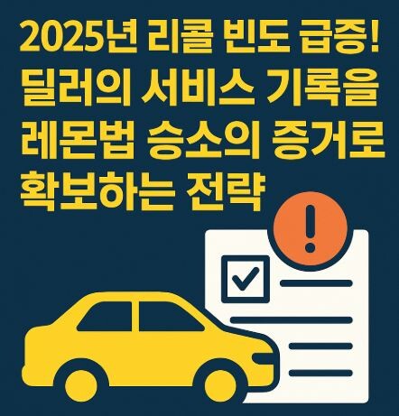 따라서 정비 이후 받는 정비 기록(R.O.) 사본을 항상 챙기세요. 기록에 문제 재현 실패(No problem found)라고 적혀 있더라도, 당신이 문제를 보고하고 딜러가 수리/점검을 시도했다는 사실 자체가 중요합니다. 이 기록들이 모여 추후 레몬법 클레임의 중요한 수리 시도 횟수를 채우게 됩니다.