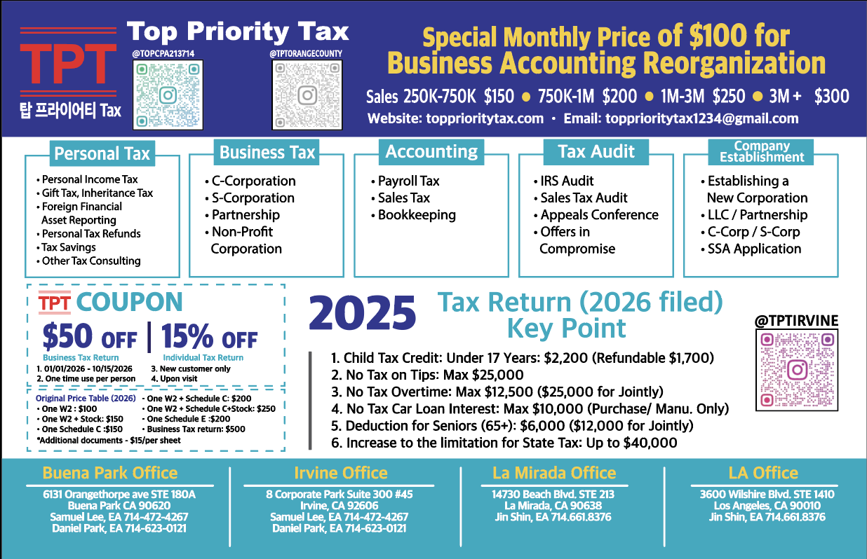 저희 탑 프라이너티 Tax는 특히 비지니스 장부정리에 많은 비용을 내고 계시는 고객분들을 위해 사업체 장부정리는 월 $100 특가 (매출 $250k 이상 $150, $750k 이상 $200, $1000k 이상 $250,$3000k 이상 $300) 로 할인서비스를 지속 하기로 하였습니다. 또한 Payroll Tax ,Sales Tax 보고도 합리적인 가격으로 월별/분기별 보고 및 Payment 까지 빈틈없이 처리해 드릴것입니다.