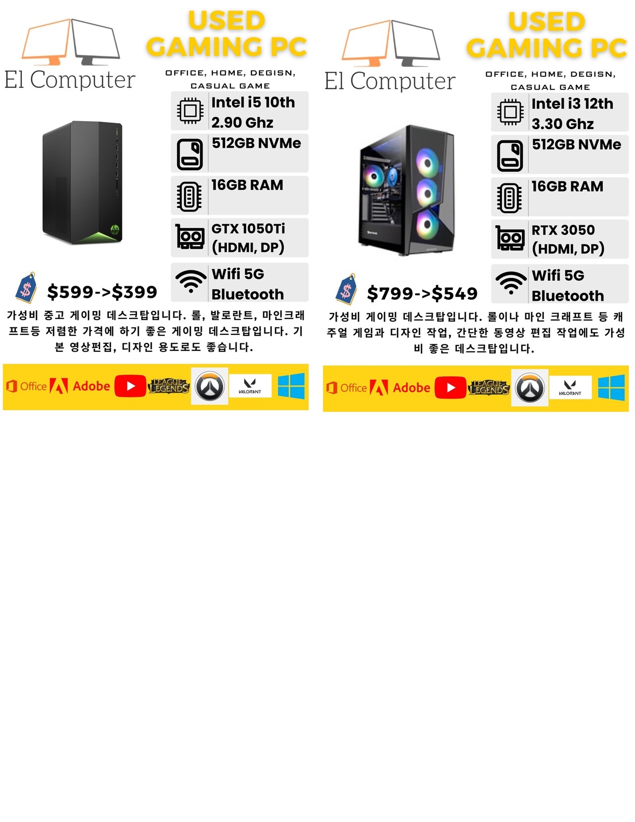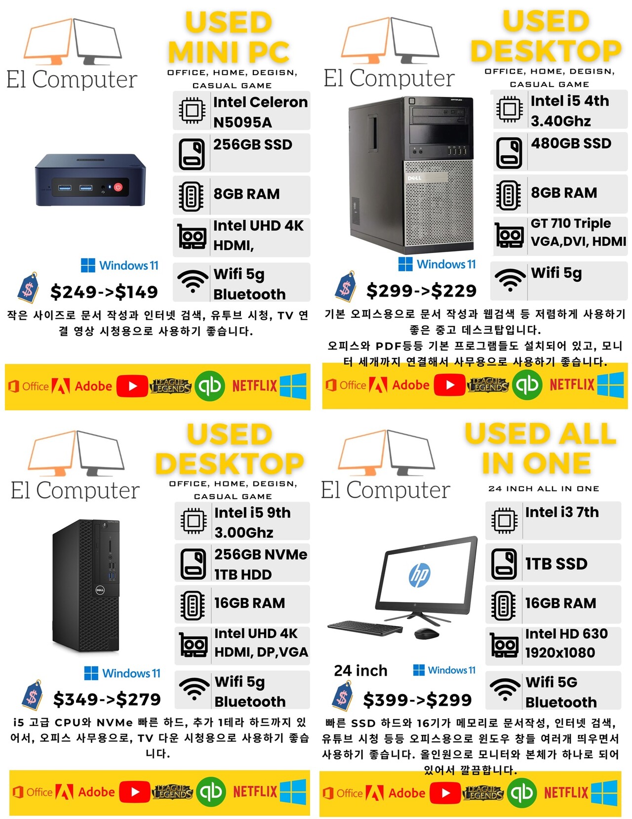 상태 좋은 중고(데스크탑, 올인원, 랩탑) 최저가로 판매합니다. 기본프로그램들, 영상, 사진 작업 프로그램들 다 설치되어 있고, 최적화 되어 있습니다.