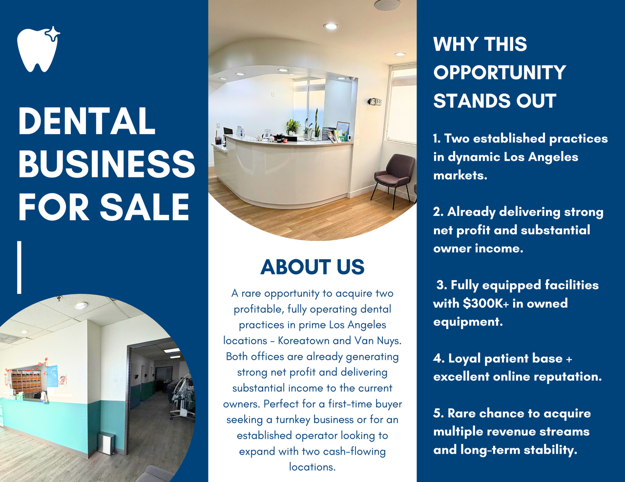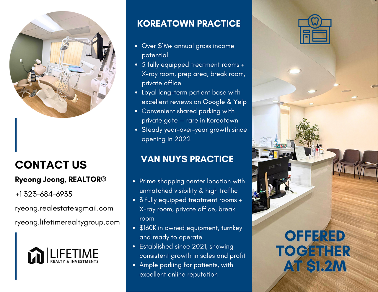 코리아타운(Koreatown)과 밴나이스(Van Nuys)에 위치한 Turnkey 치과 비즈니스를 동시에 인수할 수 있는 드문 기회를 소개드립니다.