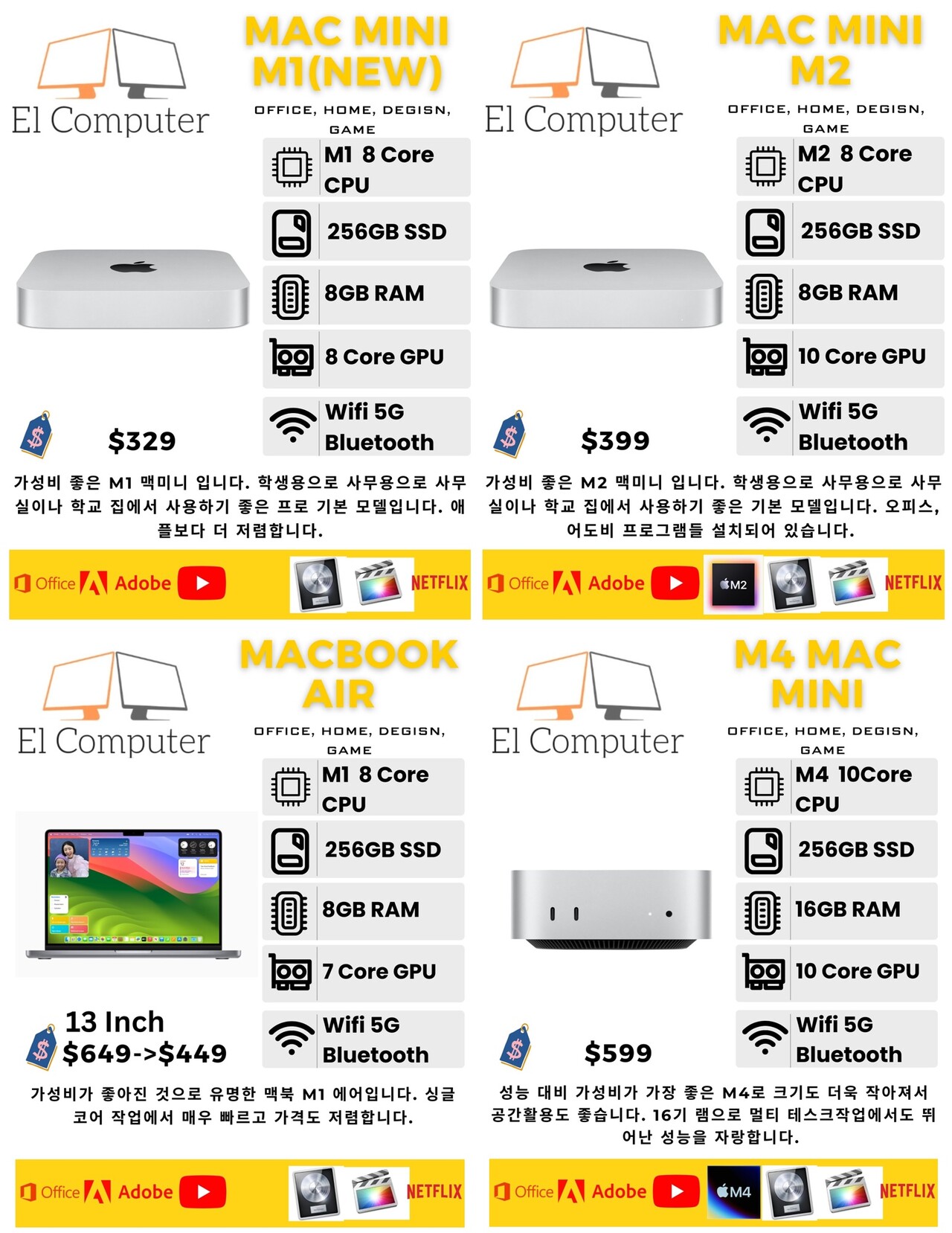 가성비 좋은 M2 맥미니 입니다. 학생용으로 사무용으로 사무실이나 학교 집에서 사용하기 좋은 기본 모델입니다. 오피스, 어도비 프로그램들 설치되어 있습니다.