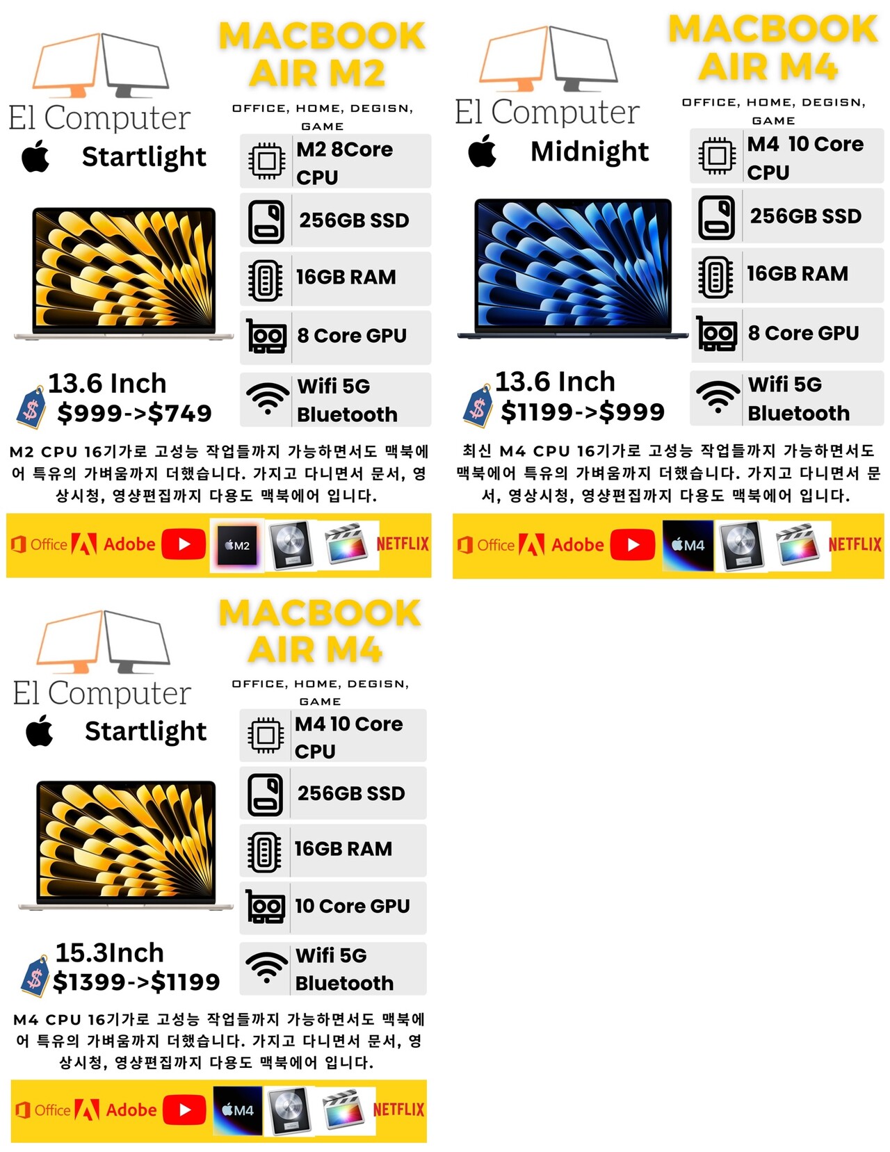 최신 M4 CPU 16기가로 고성능 작업들까지 가능하면서도 맥북에어 특유의 가벼움까지 더했습니다. 가지고 다니면서 문서, 영상시청, 영샹편집까지 다용도 맥북에어 입니다.