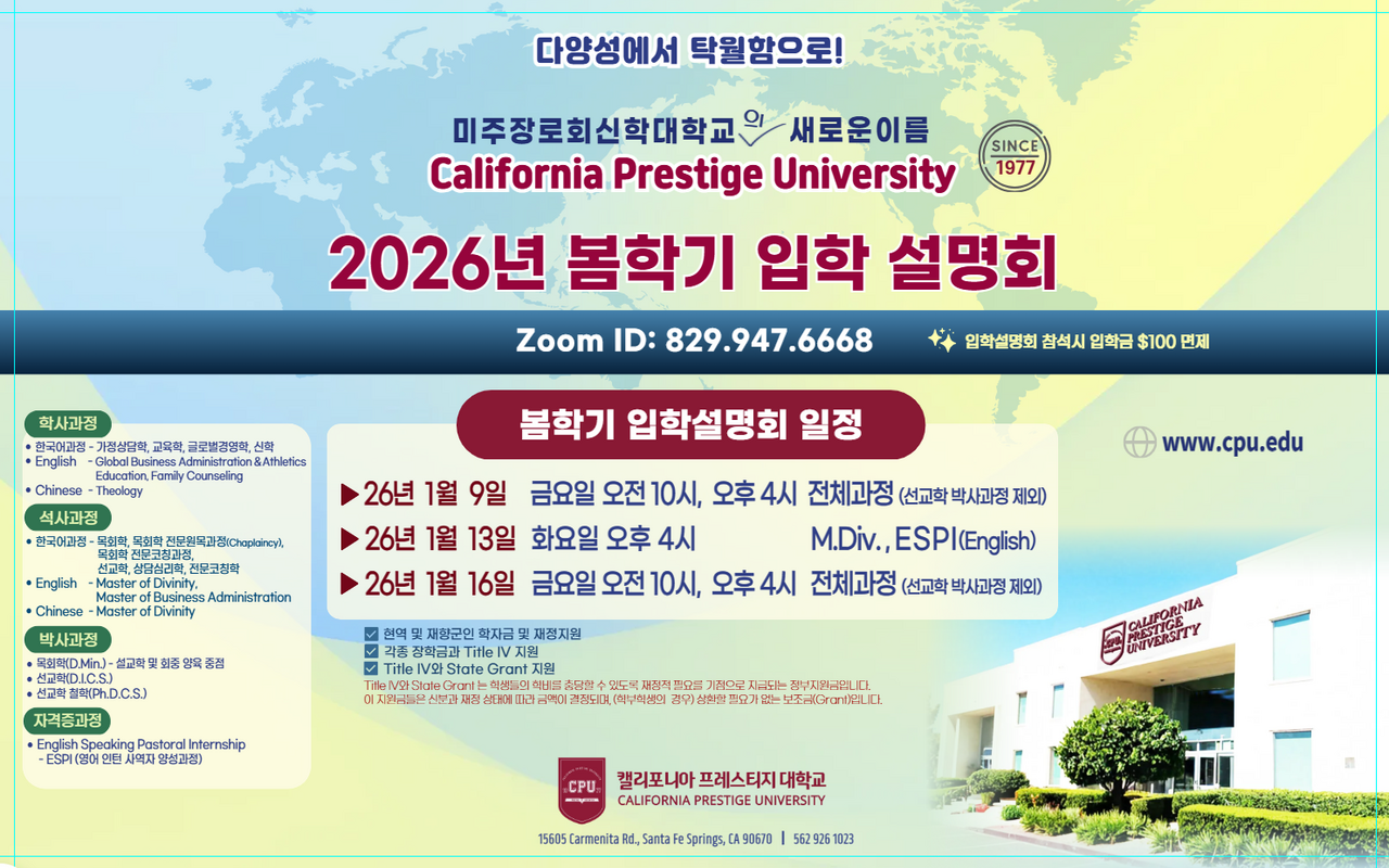 캘리포니아 프레스티지 대학교(CPU)는 2026년 봄학기 입학을 희망하는 예비 학생들을 위한 입학설명회를 개최합니다.