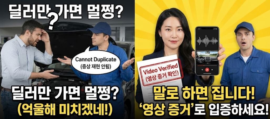 냉정하게 말씀드리겠습니다. "말로만 하소연하시면, 딜러는 끝까지 안 고쳐줍니다." 법적으로 하자(Defect)를 입증해야 할 책임은 사실 소비자에게 있습니다. 어드바이저 눈앞에서 증상이 안 나타나면, 그들은 '문제없음'으로 종결시킬 명분이 생기기 때문입니다.