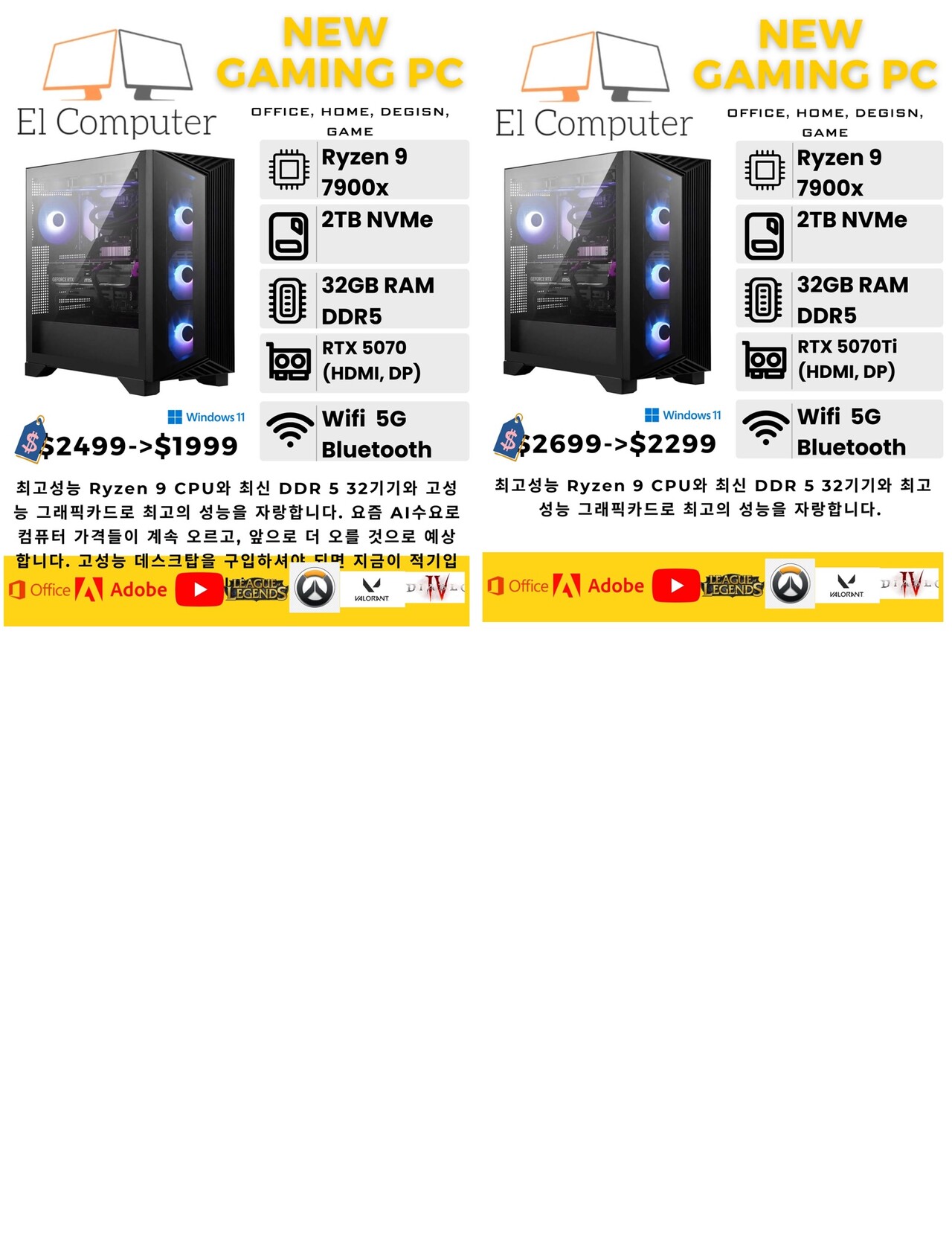 최고성능 Ryzen 9 CPU와 최신 DDR 5 32기기와 고성능 그래픽카드로 최고의 성능을 자랑합니다. 요즘 AI수요로 컴퓨터 가격들이 계속 오르고, 앞으로 더 오를 것으로 예상합니다. 고성능 데스크탑을 구입하셔야 되면 지금이 적기입니다.
