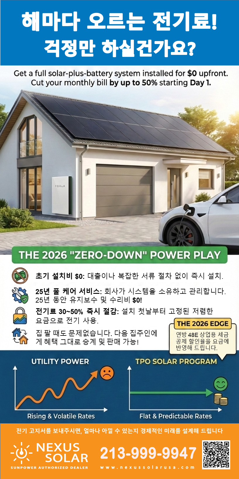 NEXUS SOLAR의 2026 "Zero-Down" 파워 플랜 – 초기 비용 $0로 시작하는 스마트한 선택.