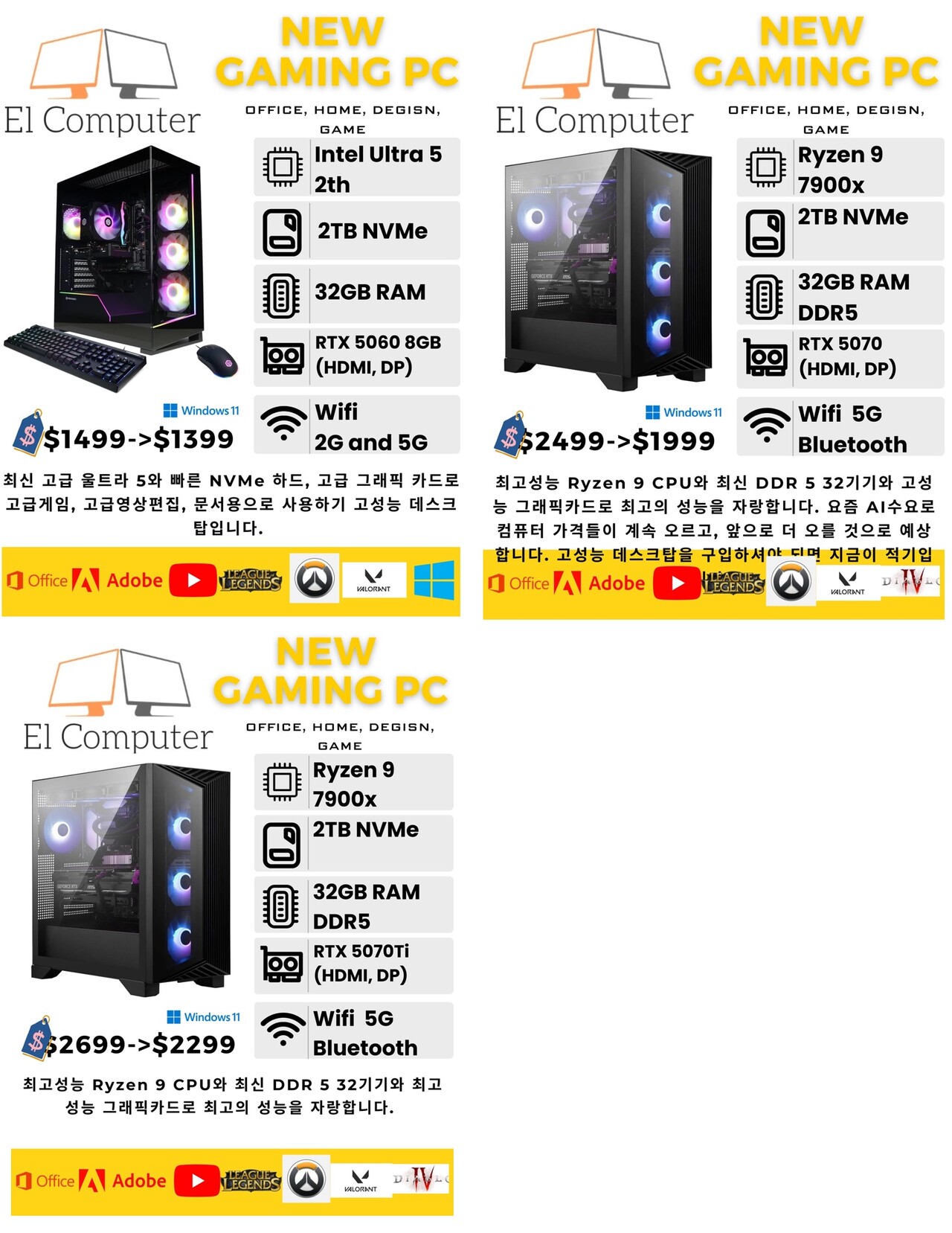 최고성능 Ryzen 9 CPU와 최신 DDR 5 32기기와 고성능 그래픽카드로 최고의 성능을 자랑합니다. 요즘 AI수요로 컴퓨터 가격들이 계속 오르고, 앞으로 더 오를 것으로 예상합니다. 고성능 데스크탑을 구입하셔야 되면 지금이 적기입니다.