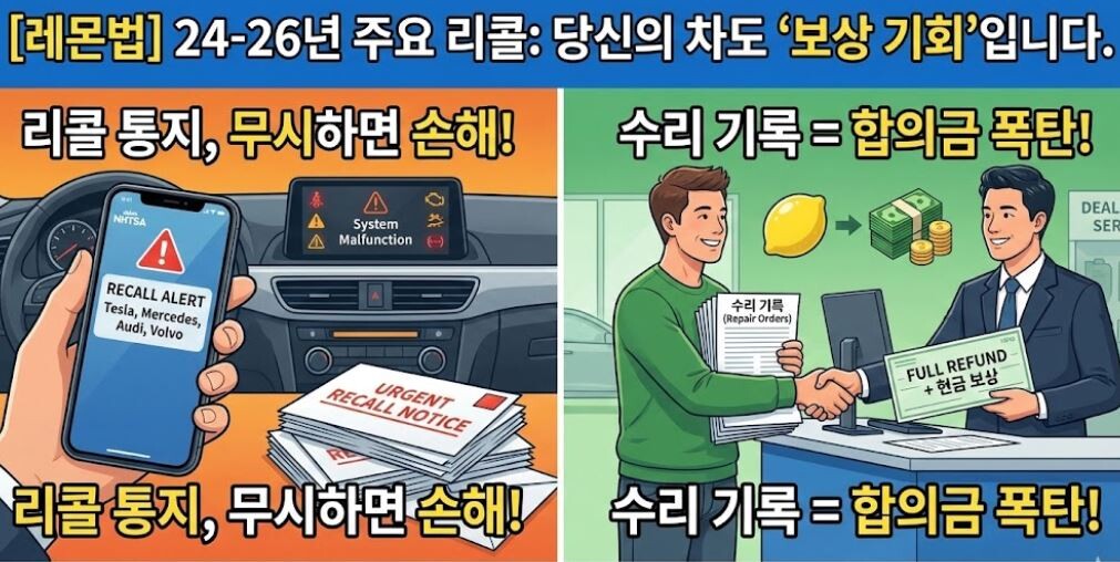 리콜은 제조사가 스스로 "우리 차에 문제가 있을 수 있다"고 인정하는 공식 문서입니다. 평소 내 차의 리콜 상태를 꼭 확인하시고, 문제가 있다면 주저하지 말고 딜러에 방문해 수리 기록을 남기십시오. 그 종이 한 장이 훗날 엄청난 금전적 보상으로 돌아옵니다. 레몬법 소송하는데 드는 소비자 비용은 $0입니다. 신용기록이나 이민기록에도 전혀 영향 없습니다. 안심하고 문의하세요.