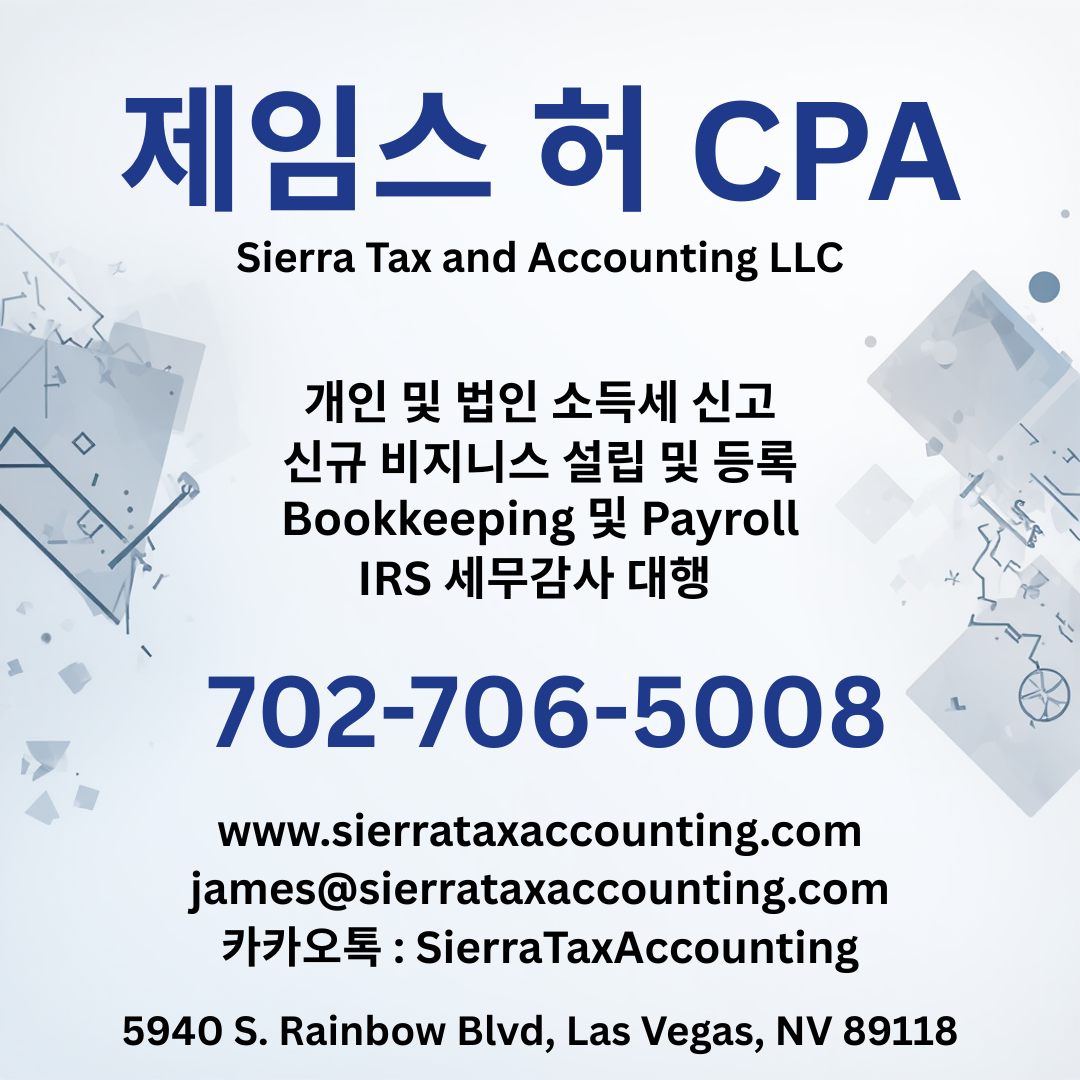 James Huh, CPA는 네바다주를 거점으로 미국 전역, 그리고 한국을 포함한 전 세계 거주 납세자를 위해 신속하고 정확한 맞춤형 세무 솔루션을 제공합니다. 복잡한 세무 이슈, 전문적인 CPA의 시각으로 명쾌하게 해결해 드립니다.