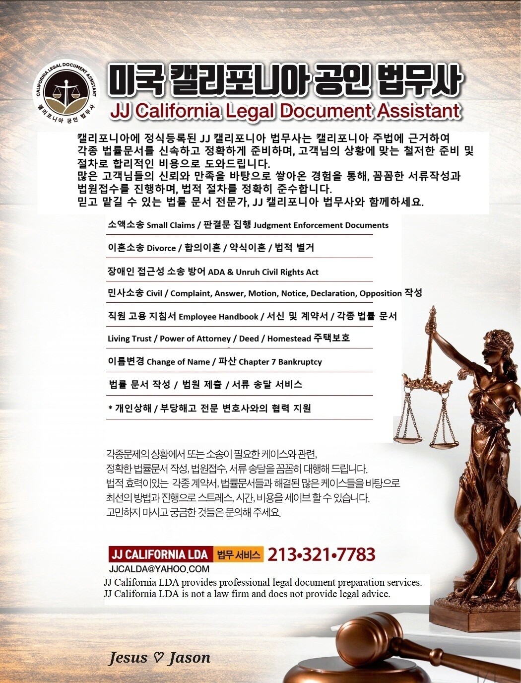 ✔️ 각종 법률 서류 관련, JJ 캘리포니아 법무사는 캘리포니아 주법에 근거하여 정확하게 준비하며 도와드립니다.