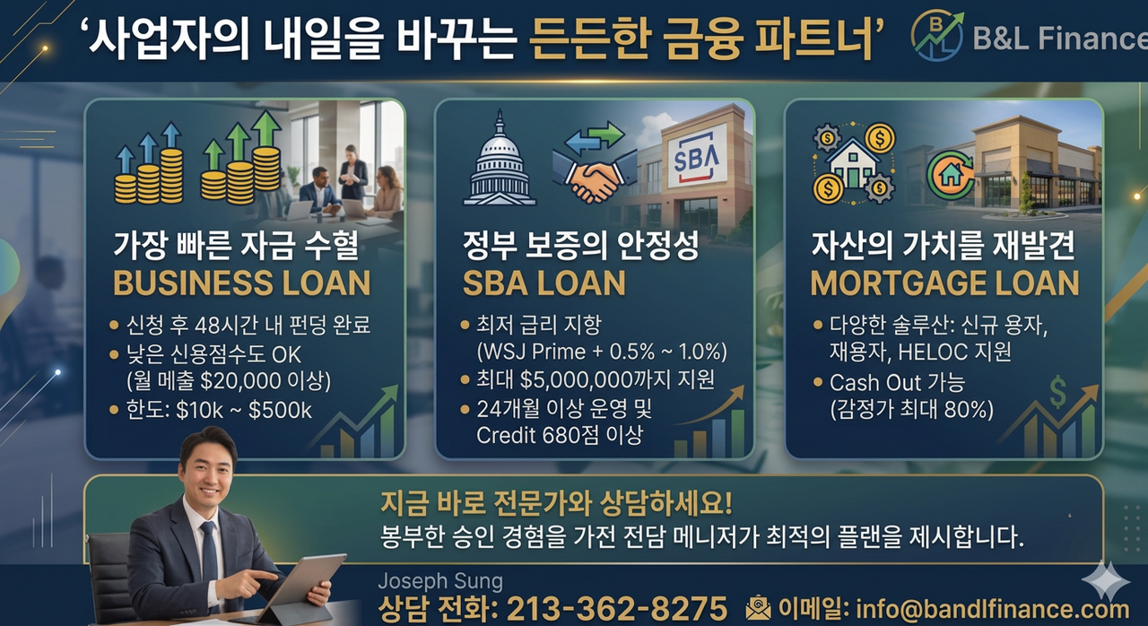 • 최저 수준의 이자율: WSJ Prime + 0.5%~1.0%의 경쟁력 있는 금리로 이자 부담을 획기적으로 줄여드립니다.