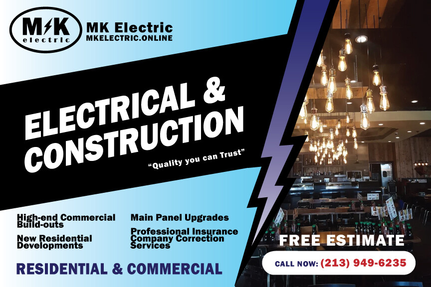 MK Electric Construction Inc.는 B(일반건설) 및 C-10(전기) 면허(#1039305)를 보유한 전문 시공사입니다.