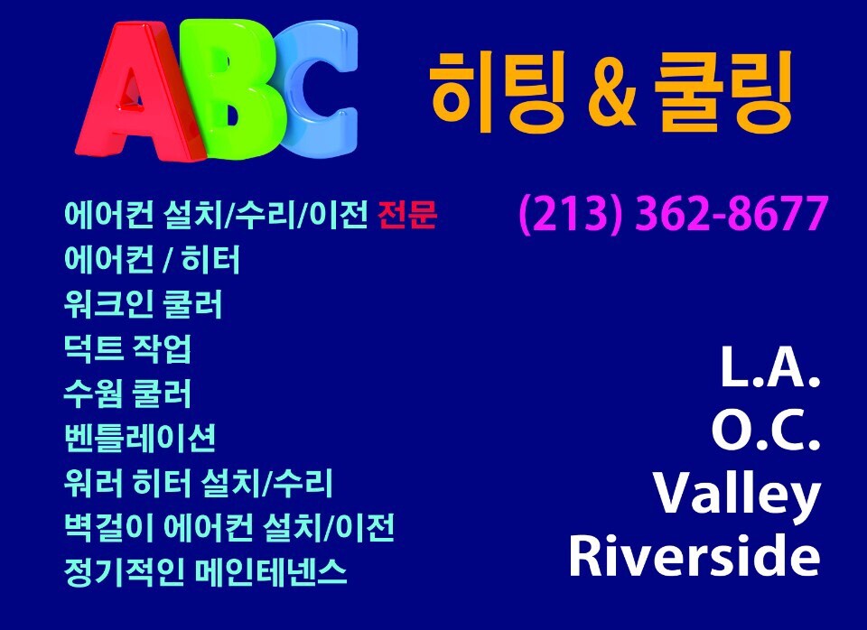ABC 에어컨,/히터/ 온수기(Tankless Water Heater), 설치 수리합니다.