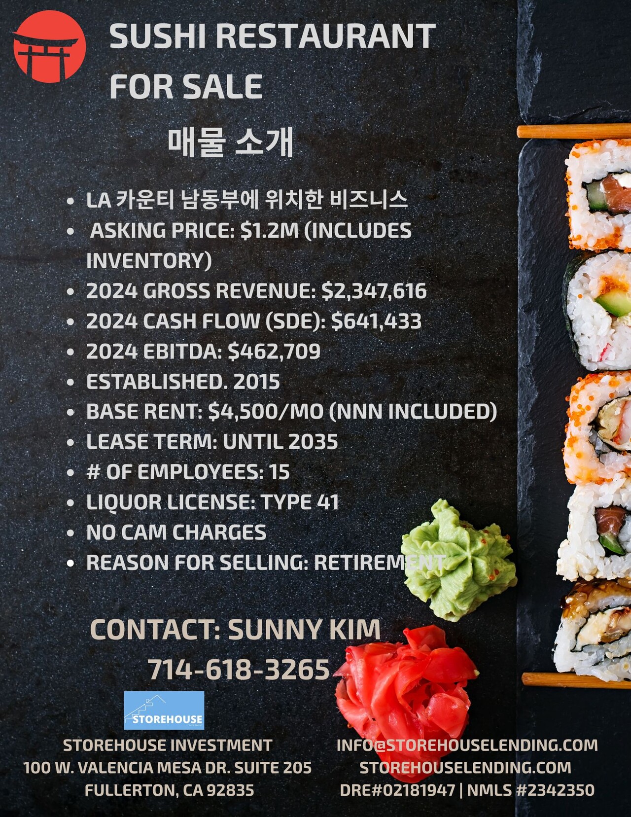 마켙에 나오지않은 매물, 오너가 10년이상 운영한 성업중인 스시 레스토랑 매매합니다.