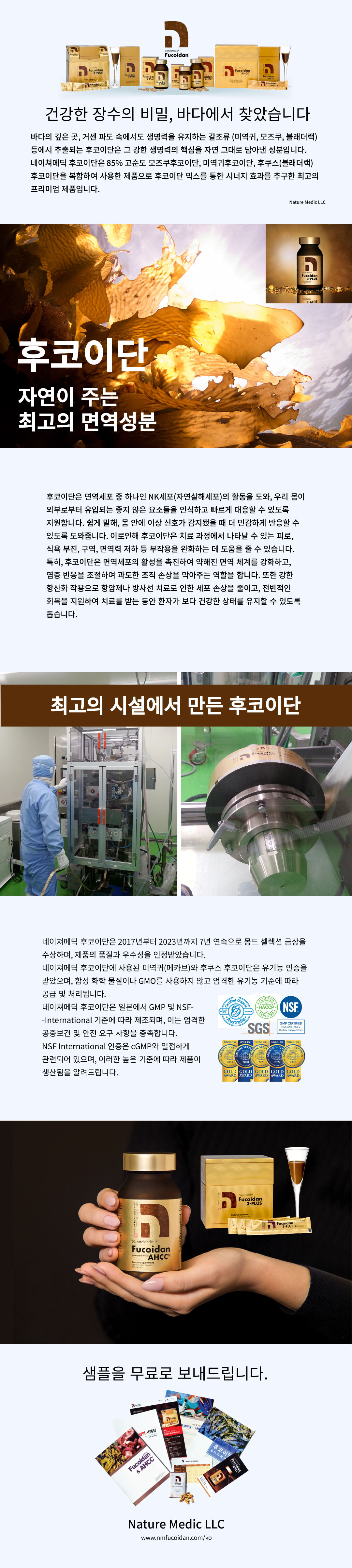 네이쳐메딕 후코이단은 2017년부터 2023년까지 7년 연속으로 몽드 셀렉션 금상을 수상하며, 제품의 품질과 우수성을 인정받았습니다. 네이쳐메딕 후코이단에 사용된 미역귀(메카브)와 후쿠스 후코이단은 유기농 인증을 받았으며, 합성 화학 물질이나 GMO를 사용하지 않고 엄격한 유기농 기준에 따라 공급되고 있습니다. 네이쳐메딕 후코이단은 미국 GMP 기준과 엄격한 공중보건 및 높은 기준의 안전 요구 사항을 충족하여 제품이 생산되고 있습니다.
