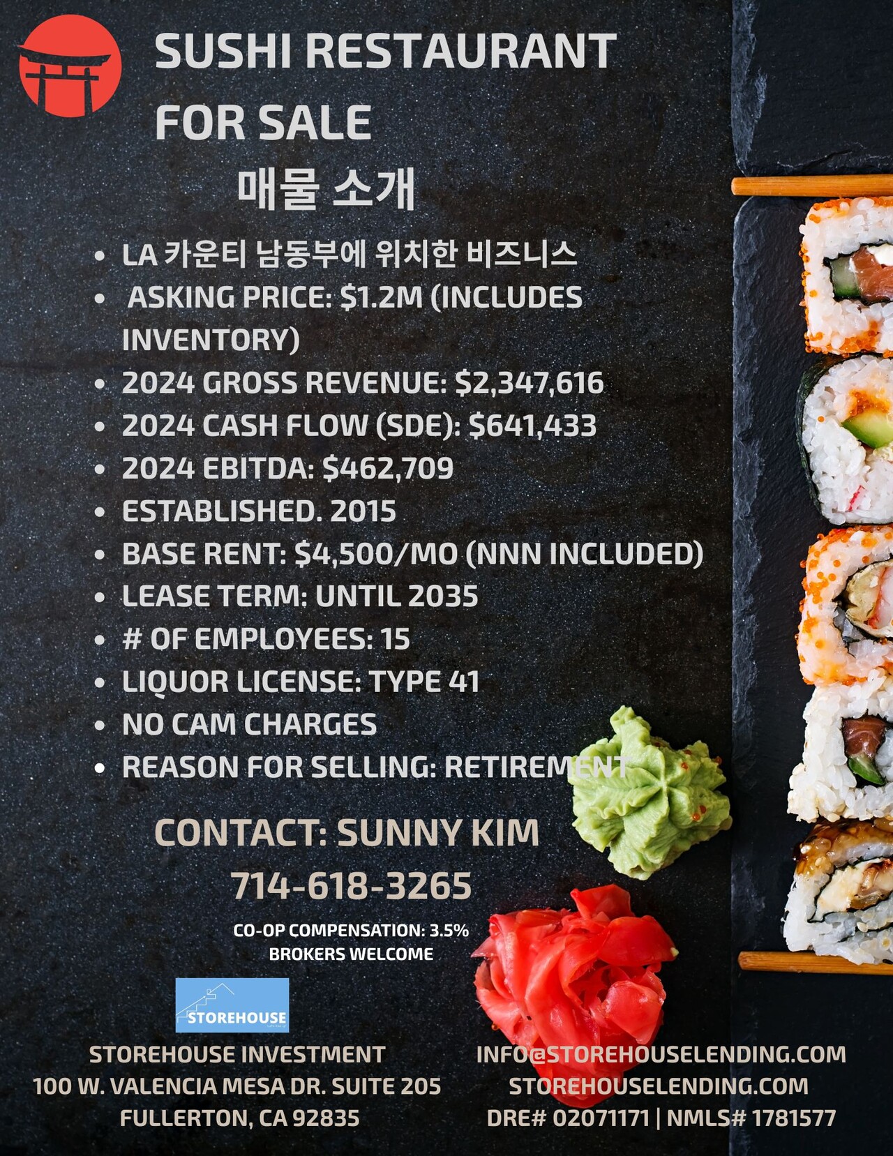 마켙에 나오지않은 매물, 오너가 10년이상 운영한 성업중인 스시 레스토랑 매매합니다.