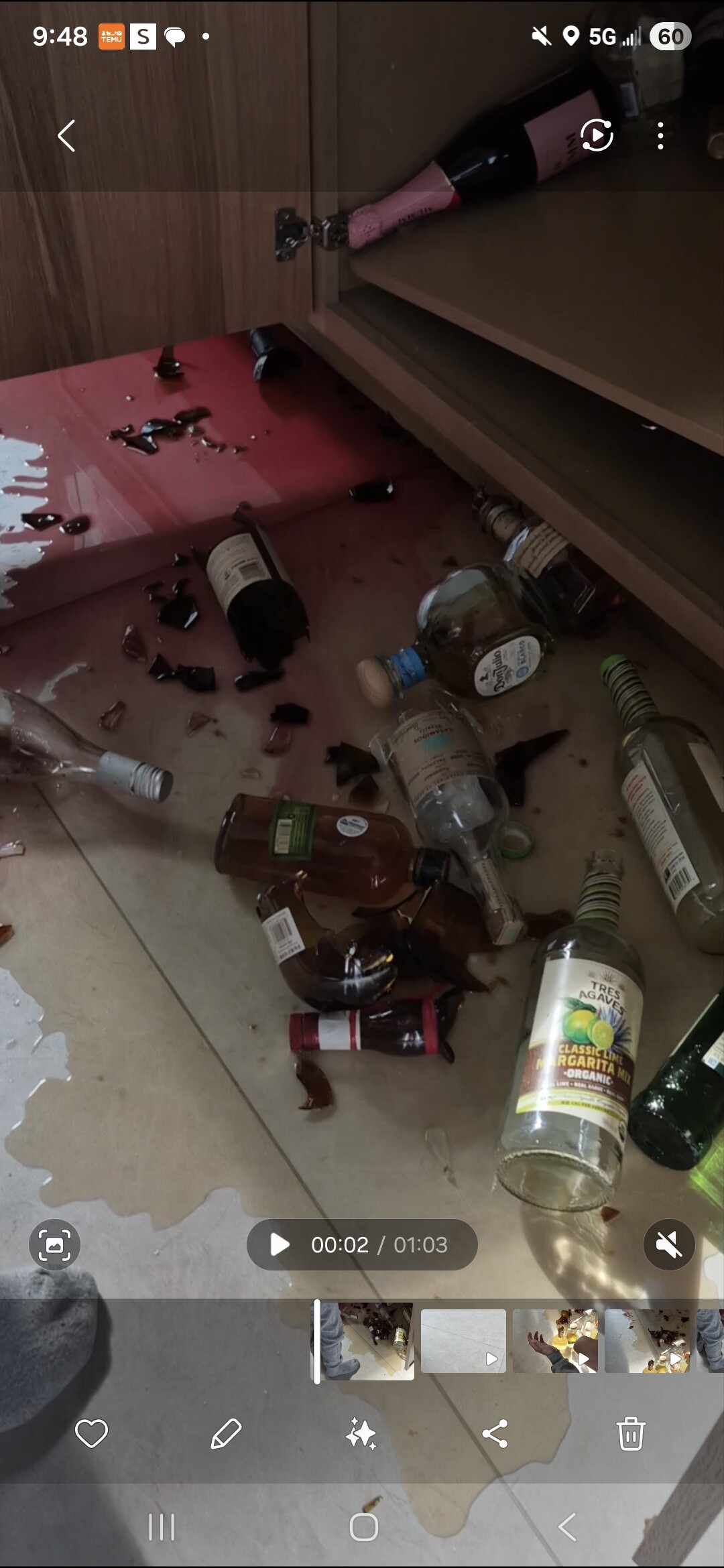 최근에 약 $14,500을 들여 캐비넷 설치를 진행했는데, 시공 상태가 매우 부실했습니다. 설치는 2026년 2월에 했고 오늘 2026년 3월 30일 사진과같은 상황이 발생했습니다. 불과 두달만에요. 설치된 서랍 트랙이 제대로 고정되지 않아 사용 중 서랍이 통째로 빠졌고, 그 밑에 있던 유리병들이 모두 깨지는 사고가 발생했습니다.이 과정에서 이번에 새로 시공한 타일 바닥에도 손상이 생겼고, 유리가 깨지면서 내용물이 캐비넷 내부로 스며들어 향후 변형이나 곰팡이 등의 2차 피해도 우려되는 상황입니다. 실제로 미끄러짐 위험까지 발생해 매우 위험한 상황이었습니다. 집에 3살, 6살아이가 매일같이 뛰어다니는 상황에 혹여 깨진유리를 밟아 다치진 않을까 매우 불안합니다.