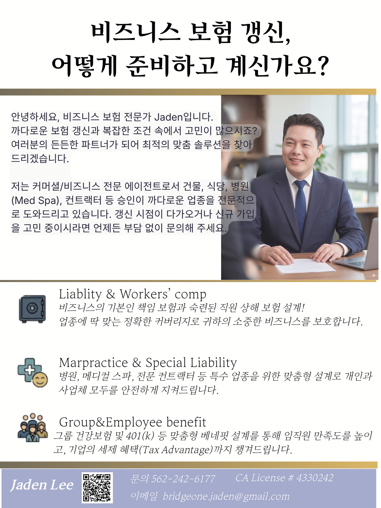 "귀하의 비즈니스를 지키는 가장 든든한 파트너, Jaden 이 대표님의 고민을 함께 해결 하겠습니다"