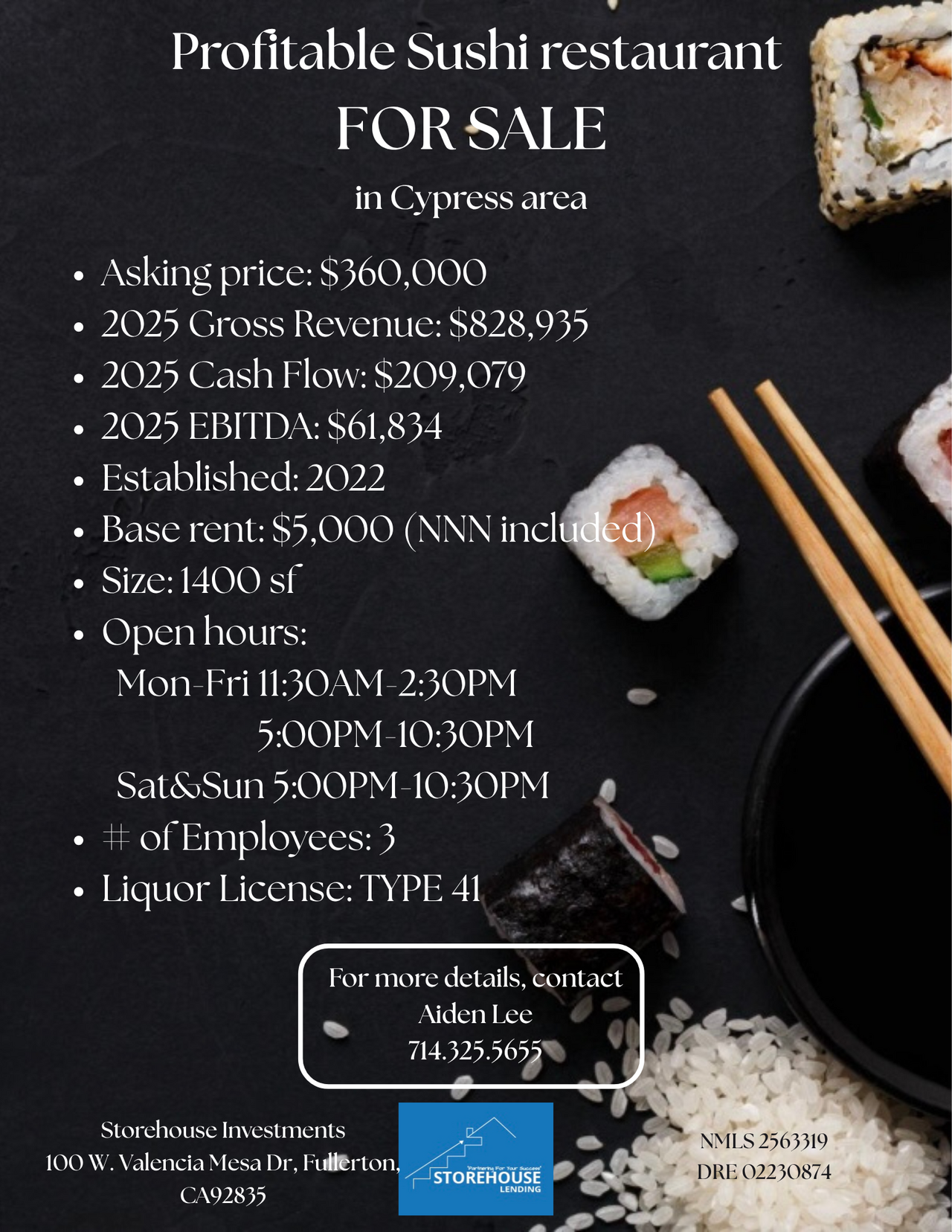 - SBA Loan 가능 (약 10~15% Down 가능)