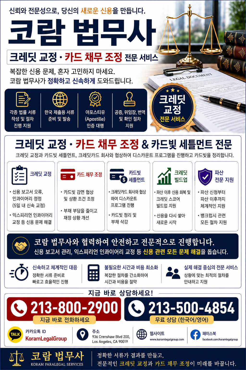 #코람법무사 #엘에이크레딧교정 #크레딧빌드업 #뱅크럽시 #엘에이법무사 #크레딧교정 #몰리김 #mollykim #creditrepair #bankruptcy #paralegal #creditrepair #mollykim #creditcardsettlement #부채삭감 #빌드업 #크레딧스코어 #크레딧빌드업 #크레딧카드세틀먼트 #신용회복 #몰리킴 #크레딧교정 #크레딧채무조정 #법무사 #코람 #법무사 #미주크레딧교정전문회사 #크레딧카드빚 #크레딧카드채무조정