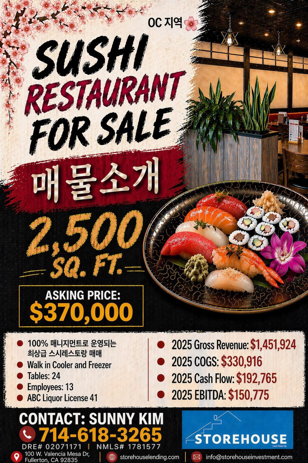 유동인구 많은 OC지역 100% 메니지먼트로 운영되는 최상급 스시레스토랑 매매