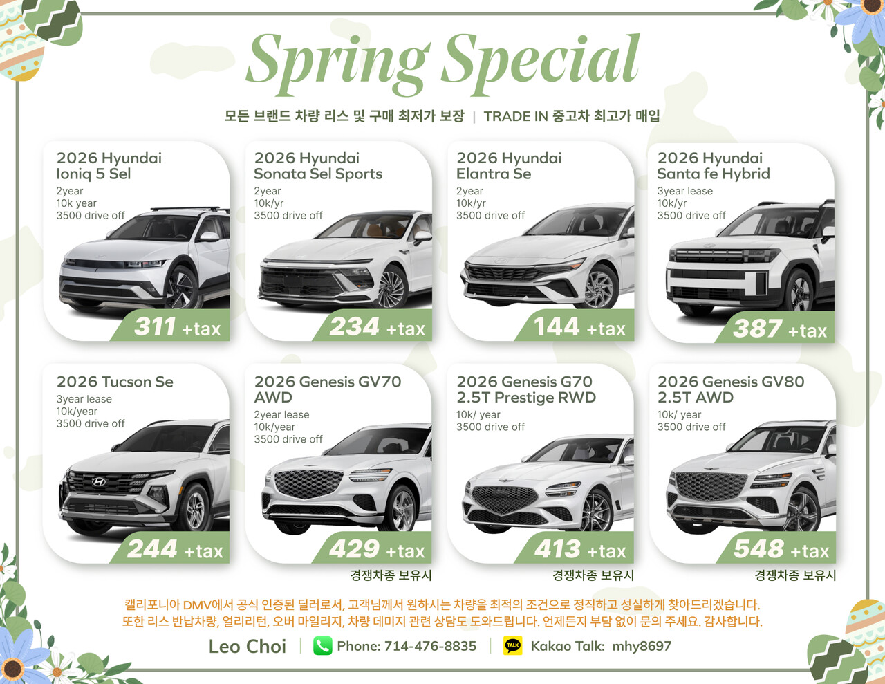 이번달은 타코마, 엘란트라, 코나 등이 저렴하게 나와있습니다! LEO만 주는 특별한 세일 가격으로 모시겠습니다.