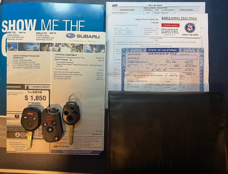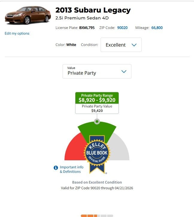 2013년식 스바루 레거시 2.5i Premium AWD(색상: 화이트)를 판매합니다. 주행 거리는 66,900마일로 매우 짧으며, 차량 상태 및 주행 성능은 최상입니다. 아이나비 블랙박스 설치되어 있습니다.