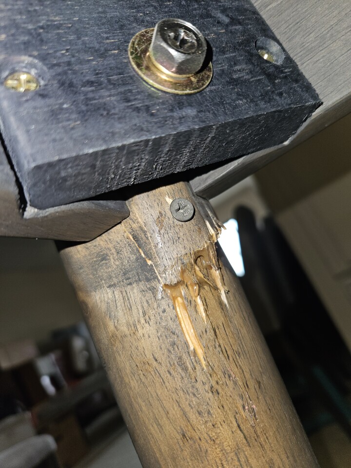 다리 하나를 옮길때 부딪혀서 못으로 고정했습니다.