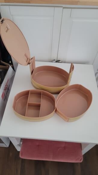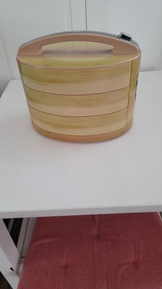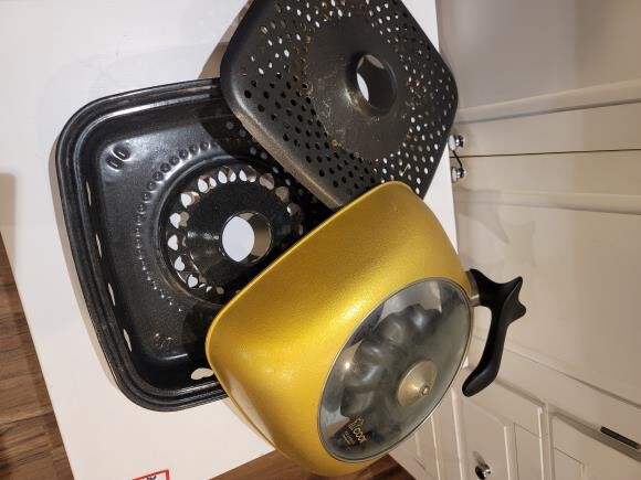 특징: 하단 팬(검은색 사각형), 구멍이 뚫린 내부 팬/그릴, 그리고 상단 덮개로 구성되어 있습니다.