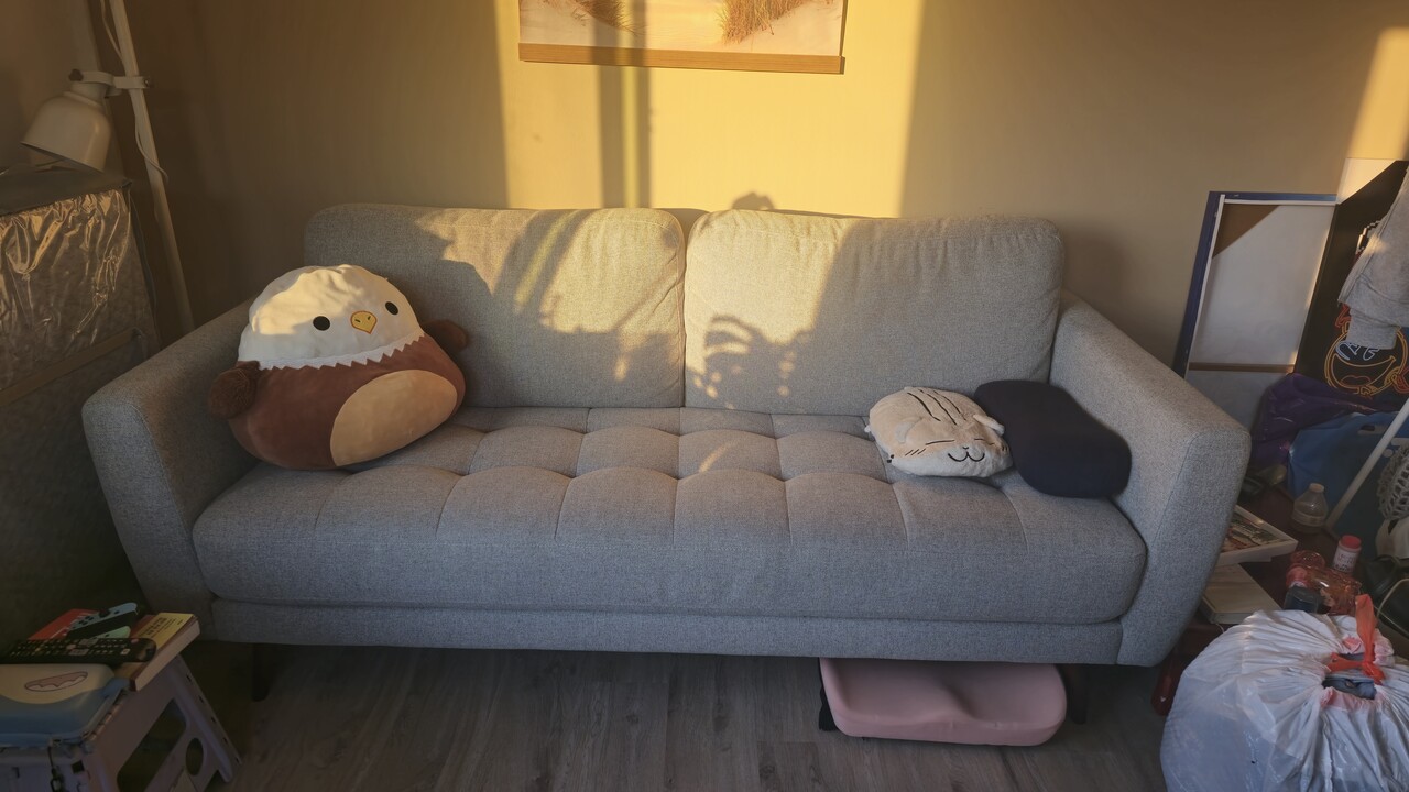 밝은 그레이 색 천으로 되어 있으며 2인용이지만 3명이서 앉을수있는 크기입니다