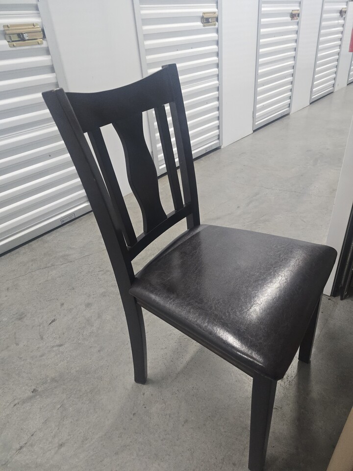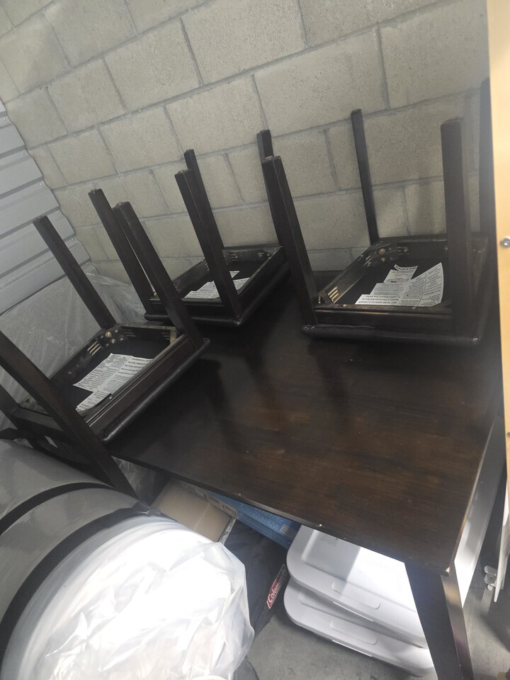 사용감이 있지만 넓직하고 짙은 고동색 나무로 된 깔끔한 디자인의 식탁입니다.