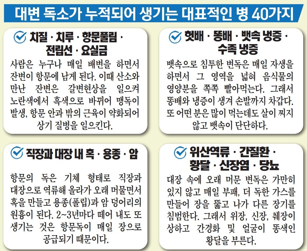 ☑고관절 통증·골다공증·백혈병·허리디스크·변비 대변독은 항문과 가장 가까운 꼬리뼈로 스며들어 골반 전체의 기능을 떨어뜨려 고관절 통증과 골다공증이 생기고 꼬리뼈가 약화시켜 피를 제대로 만들지 못하는 백혈병을 가져 온다. 변독은 골반을 지나 허리쪽으로 상향 이동, 디스크를 녹이고 허리가 약해지면서 어느 날 변비가 찾아온다.