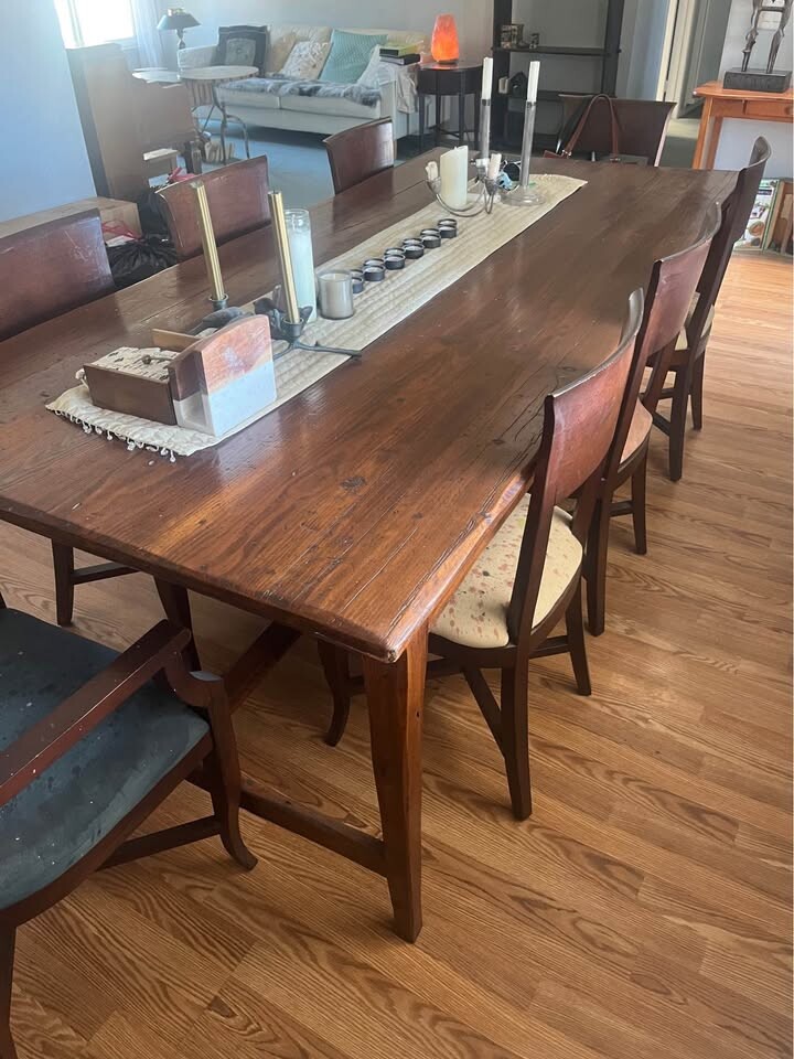 식탁은 프랑스제 이며 (10년전 $4500 주고 구매) , 거의 사용을 안해서 매우 깨끗하며 의자 8개 포함: $2000