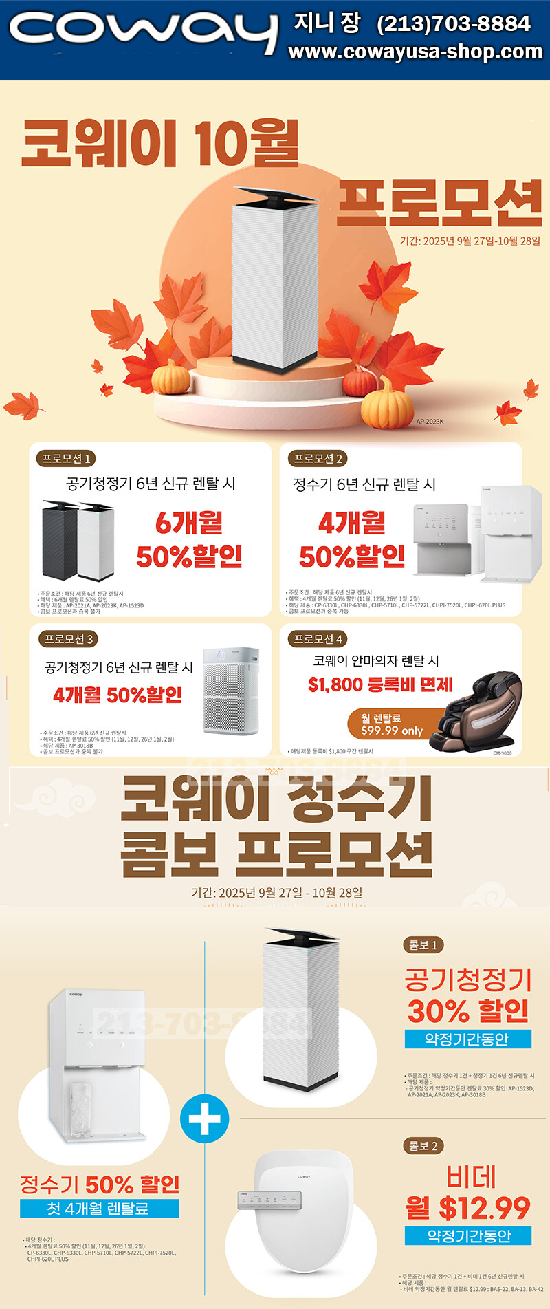 C0WAY 10월-213.703.8884 6개월 최대 50%할인. 정수기 공기청정기 비데 연수기 맛사지체어