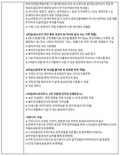 • 기반시설: 상·하수도 완비, 도시가스 예정, 시스템 냉난방기 포함