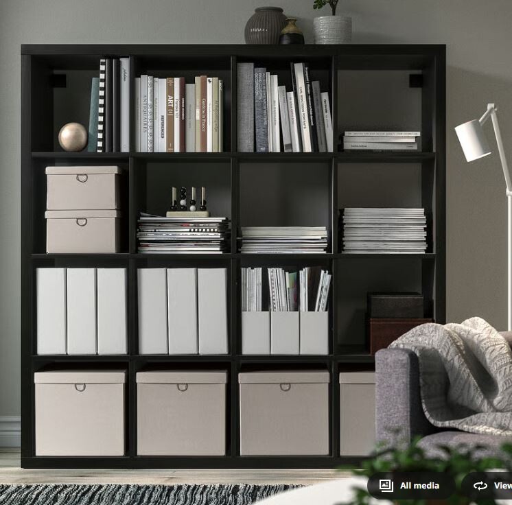 이 제품은 **IKEA KALLAX 선반 유닛(블랙브라운 색상)**으로, 크기는 **57 7/8" x 57 5/8" (147 x 147cm)**입니다.