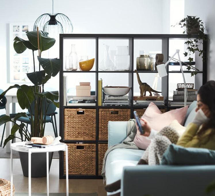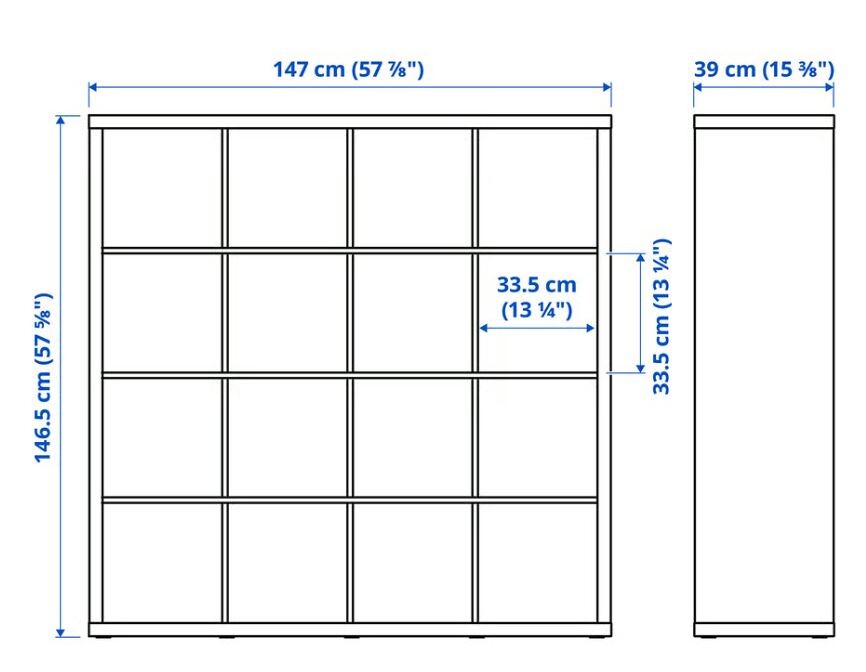이 제품은 **IKEA KALLAX 선반 유닛(블랙브라운 색상)**으로, 크기는 **57 7/8" x 57 5/8" (147 x 147cm)**입니다.