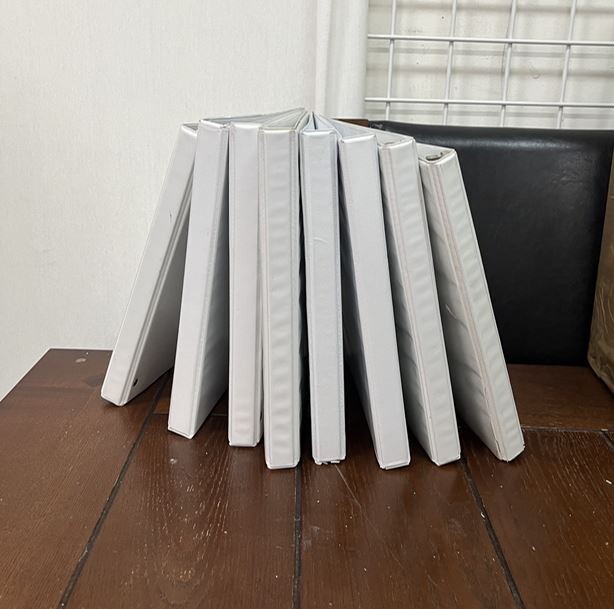 다양한 크기와 색상의 중고 3홀 링 바인더 세트입니다.
