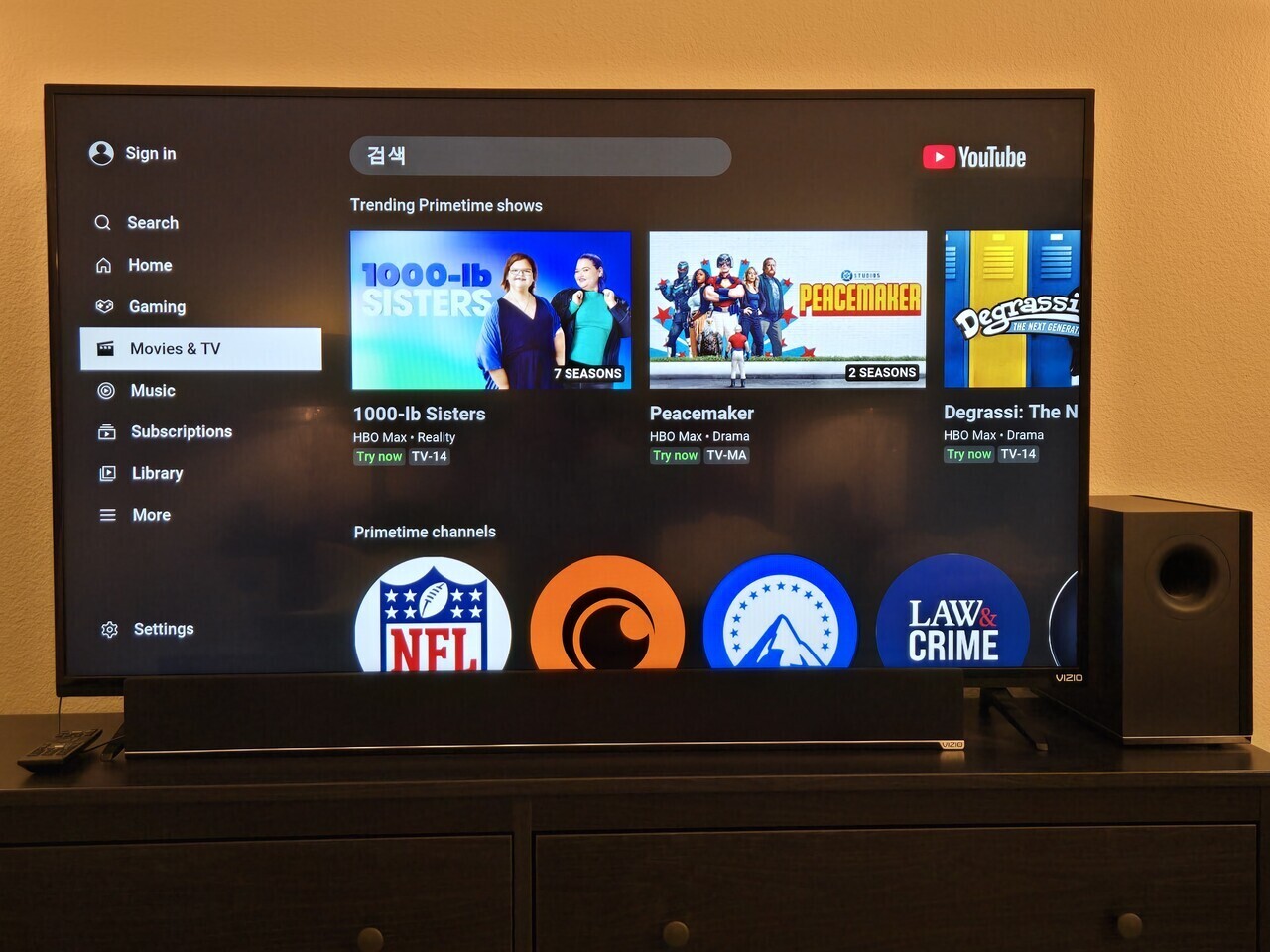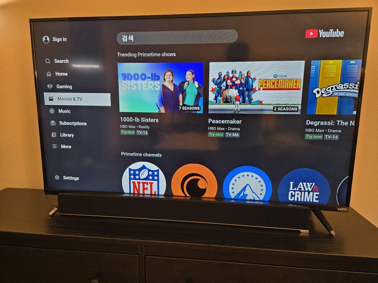 뛰어난 편의성 (스마트 TV): Vizio SmartCast 플랫폼을 통해 리모컨 하나로 모든 OTT 서비스를 간편하게 이용할 수 있습니다. (사진 속 YouTube 화면 참고)