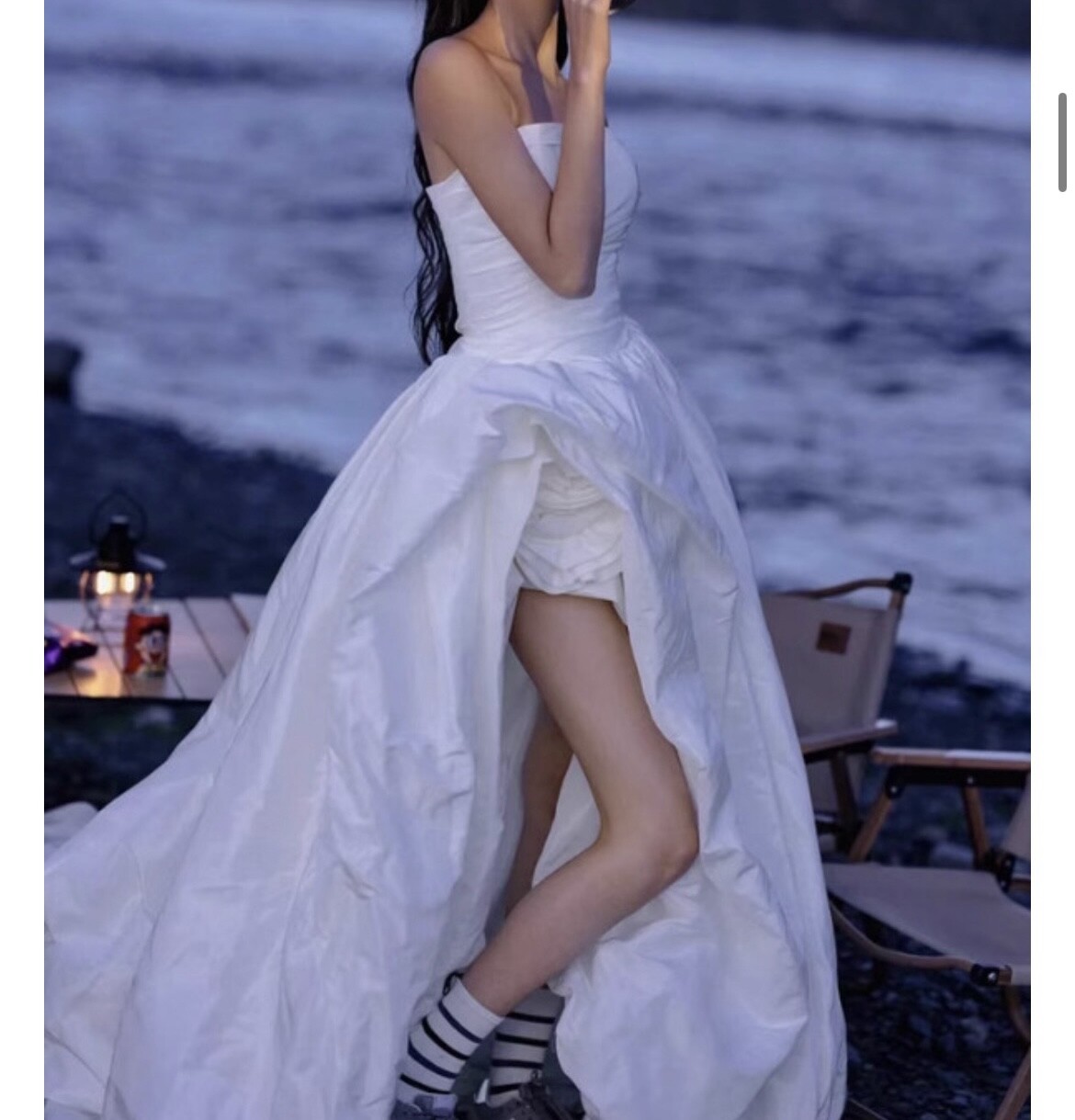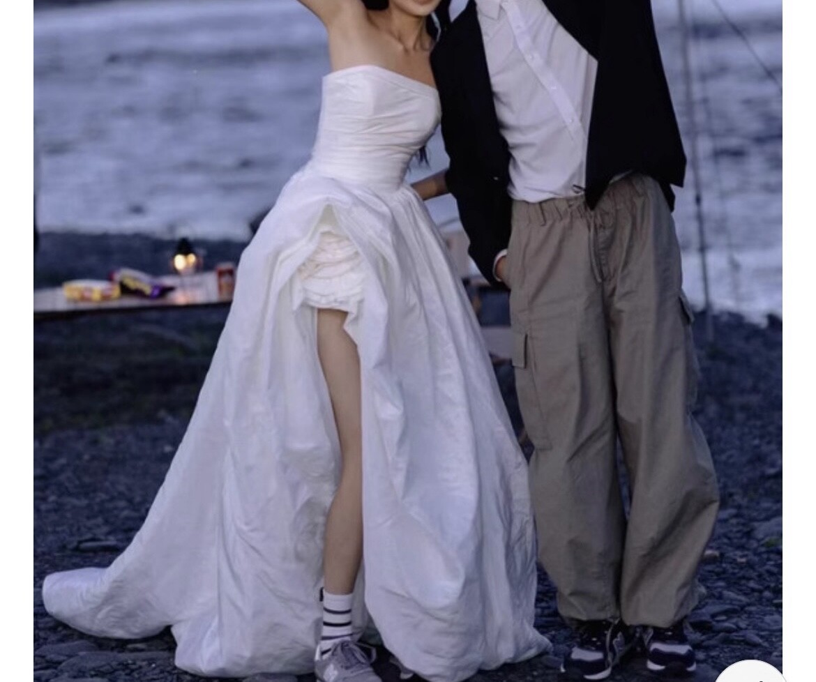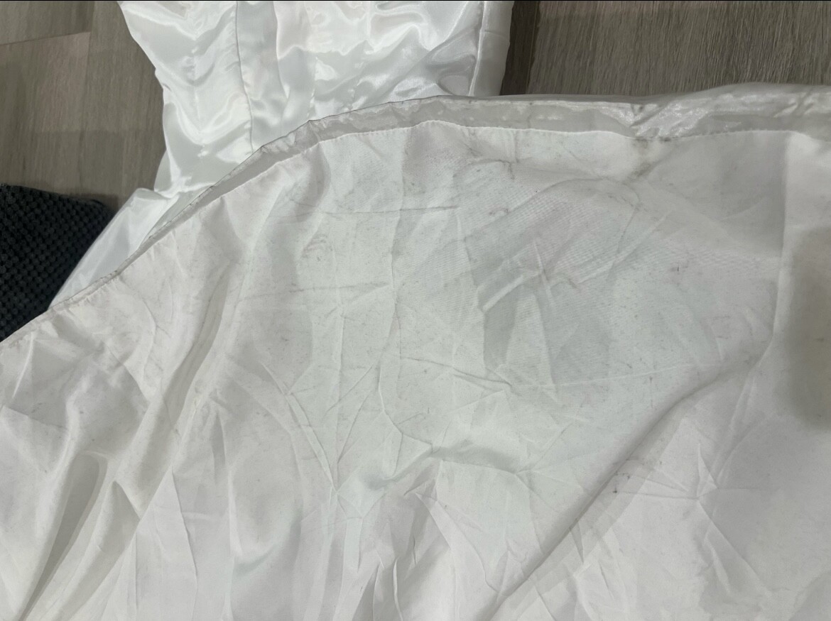 한번 야외촬영때 입었고, 드레스 뒷안감에 바닥쓸려서 살짝 오염있는데 겉으로 보이는건 멀쩡해요 (4번째사진 참고).