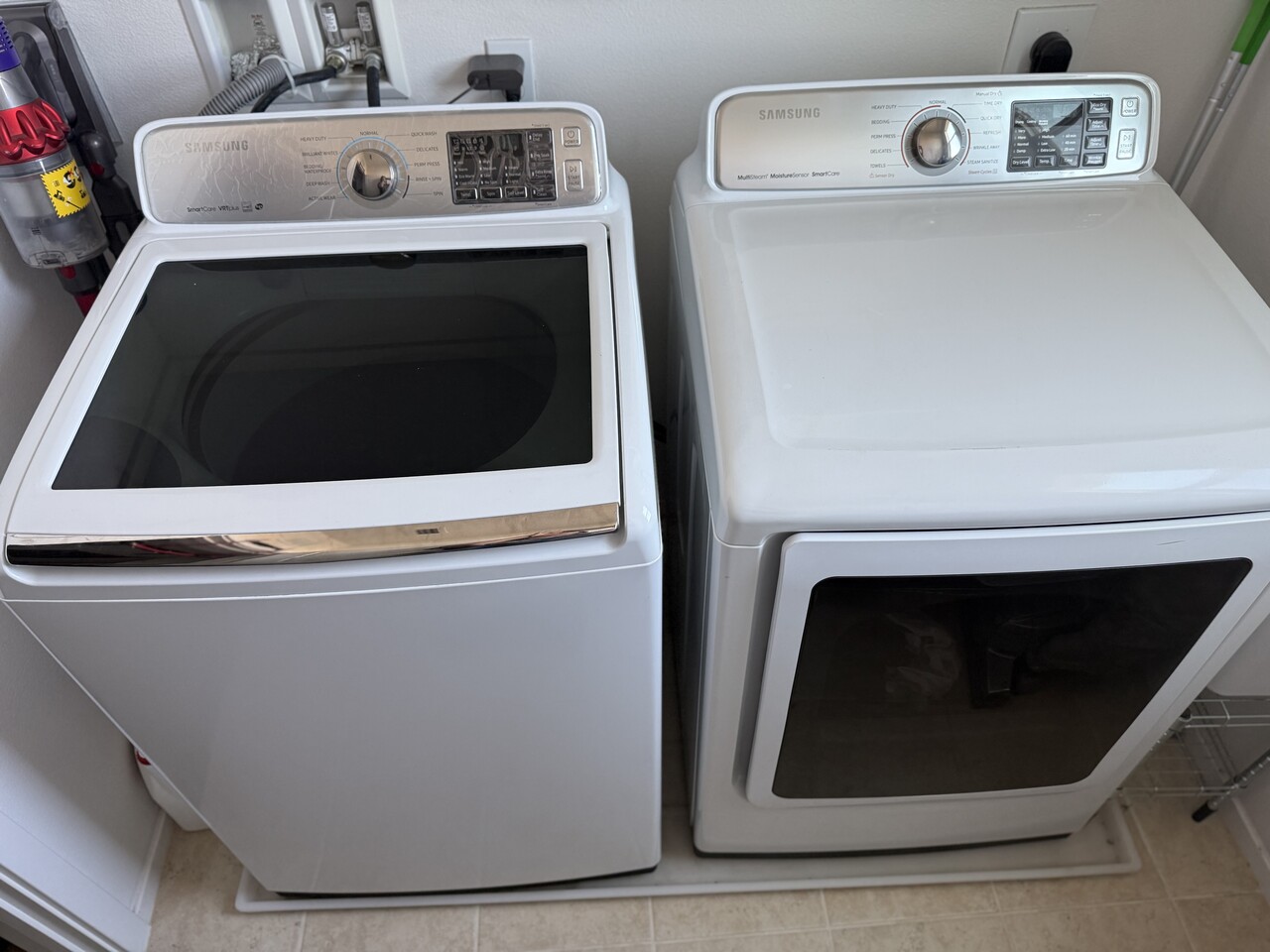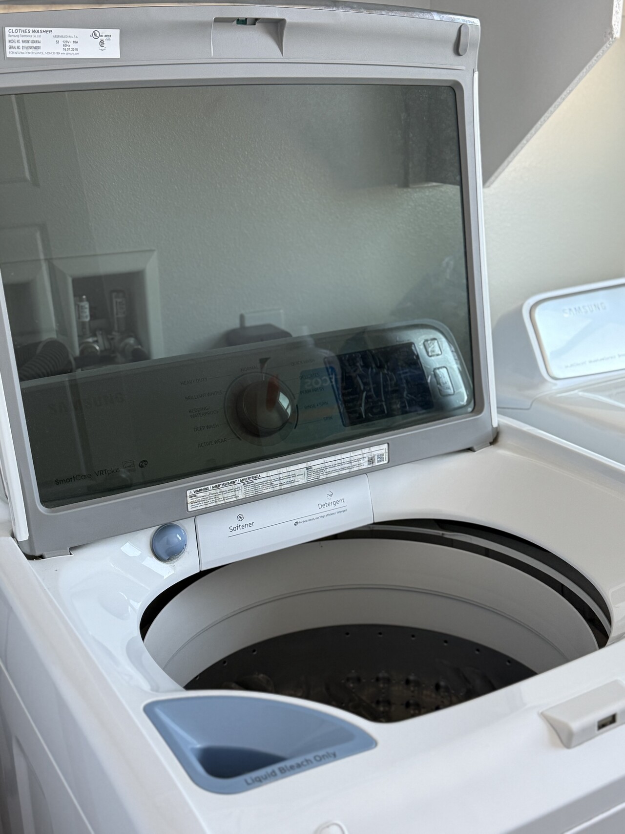 ● Samsung 5.5 cu. ft. Top Load Washer with Super Speed Wash and 7.4 cu. ft. Smart ELECTRIC Dryer with Steam Sanitize