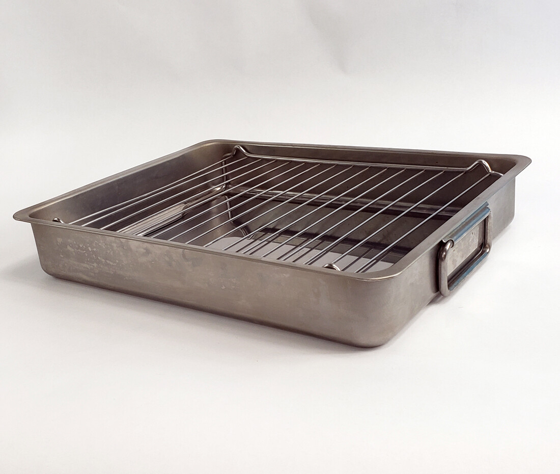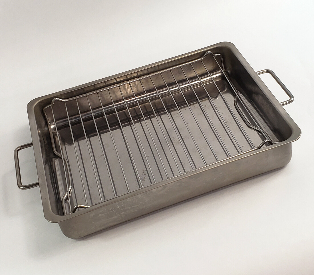 A perfect all-in-one roasting tin for the oven or barbeque. At the bottom there is room for potatoes and vegetables and on the grill rack you can put chicken or steak.