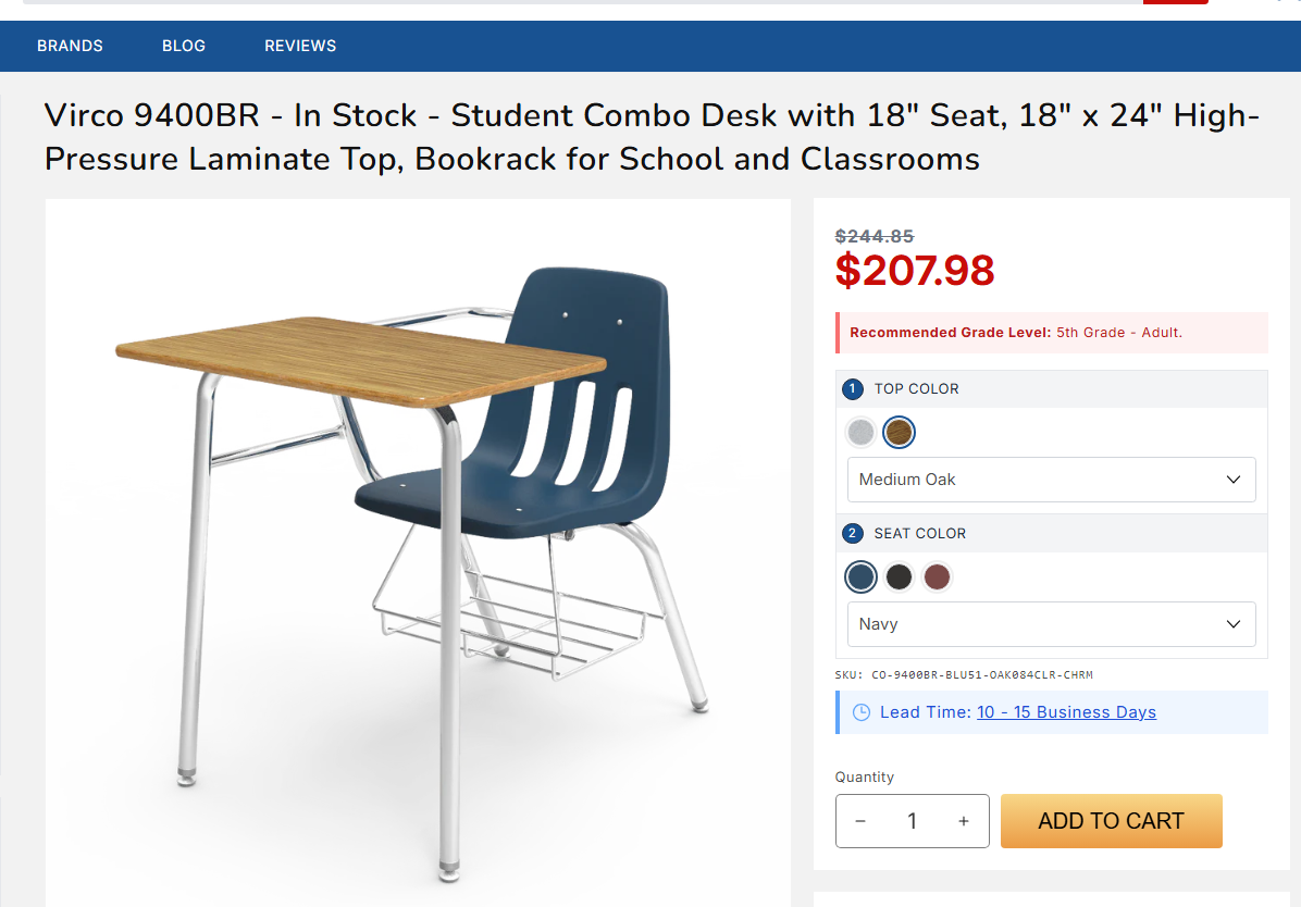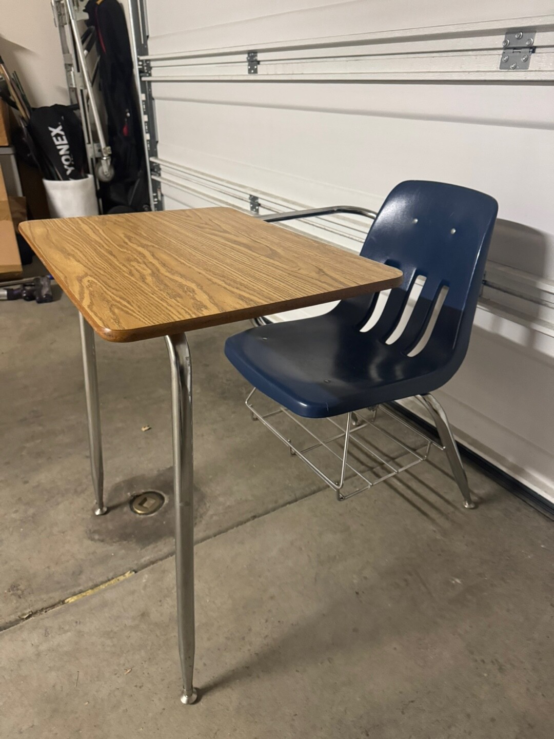 의자와 책상이 일체형이며, 아래쪽에는 가방이나 책을 놓을 수 있는 보관 선반도 있습니다.