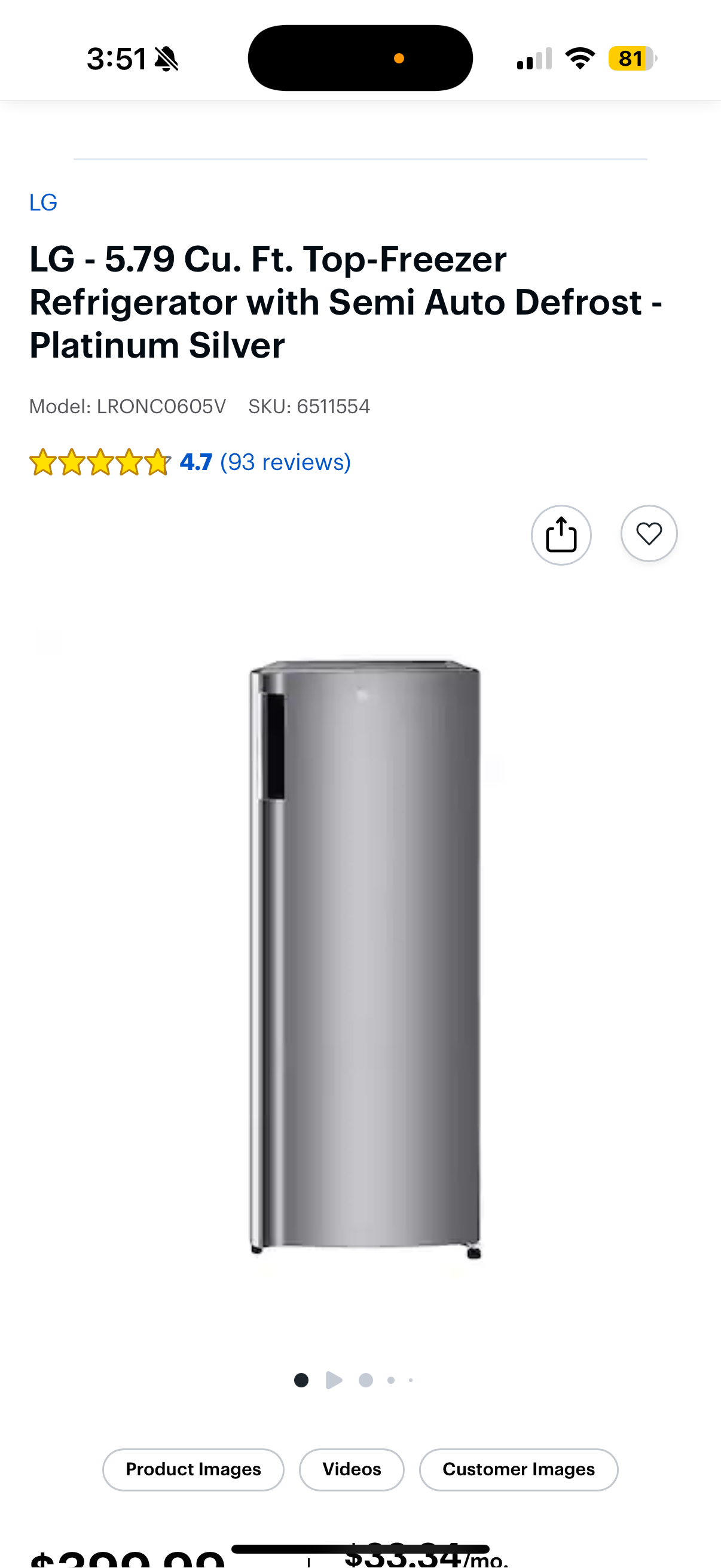 - https://www.bestbuy.com/product/lg-5-79-cu-ft-top-freezer-refrigerator-with-semi-auto-defrost-platinum-silver/JJ8VPZ69S6/sku/6511554?utm_source=feed&extStoreId=&ref=212&loc=19602590364&gclsrc=aw.ds&gad_source=1&gad_campaignid=19602598935&gbraid=0AAAAAD-ORIiJLwAo16URyhm4fxO88W8y4&gclid=Cj0KCQiA_8TJBhDNARIsAPX5qxQNacyaIPAIkOmQjif8eUHmekFbqAMcnrXT4Aw2zZ-pQzrNH3xD0fsaAr2eEALw_wcB#gad_source_1